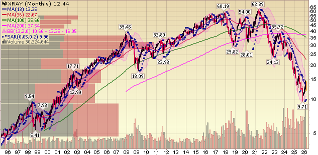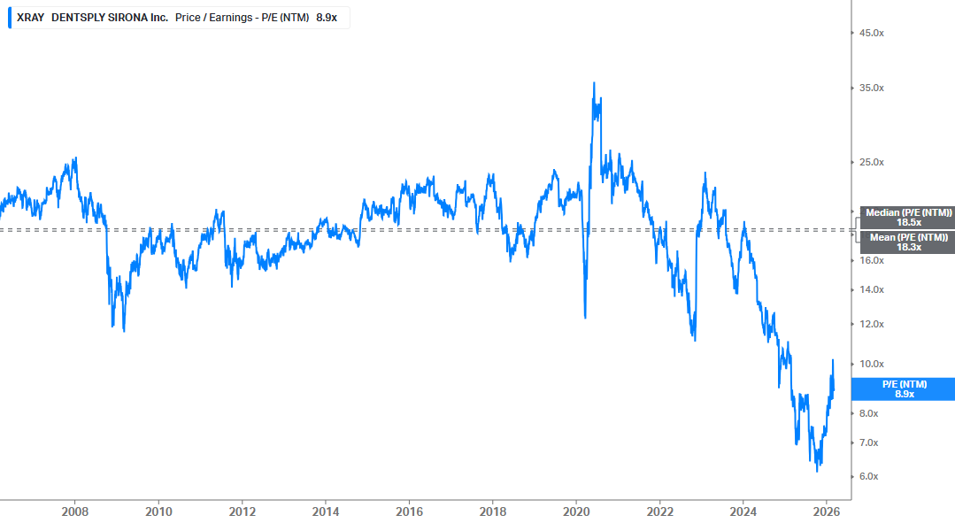 XRAY’s own history tells the same story. Over the past two decades, the company has traded at ~18x forward earnings. Today, the multiple sits at just 8.9x, leaving plenty of room for mean reversion.