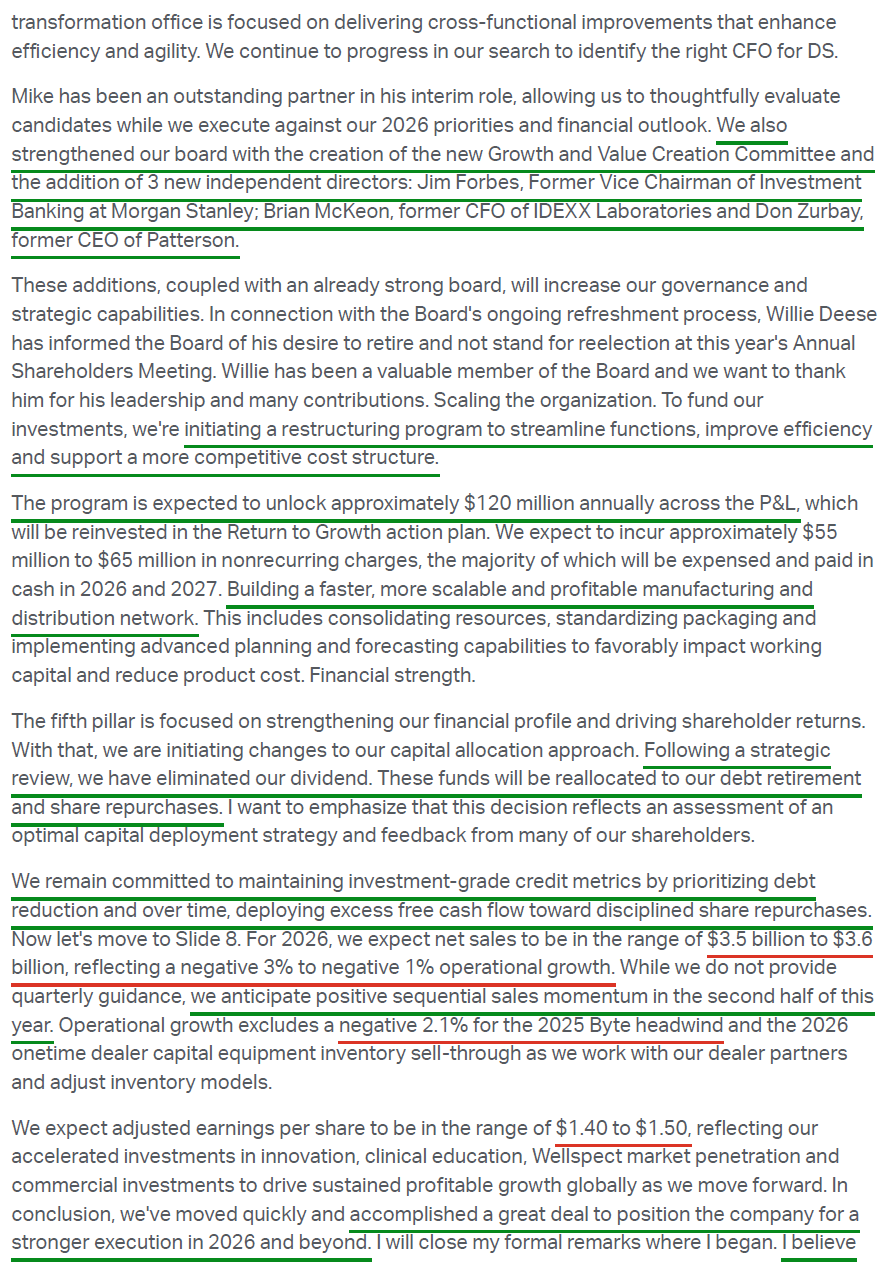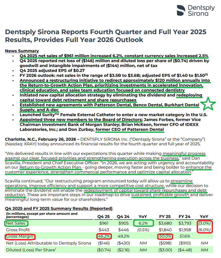 As we have said from day one, much of the heavy lifting in the XRAY turnaround was carried out under prior management, which spent the past several years course-correcting and stabilizing the business by taking ~$300M of costs out through a 10% headcount reduction, a 60% SKU reduction, and consolidation across the supply chain and manufacturing footprint. While prior management got the house in order from a cost and efficiency standpoint, those efforts could only go so far. You cannot cut your way to growth. FY25 marked the second consecutive year of sales declines (-3% in FY25, -4.3% in FY24). To be fair, the dental sector is highly cyclical and just starting to emerge from a trough, but XRAY has still lagged peers in the recovery.