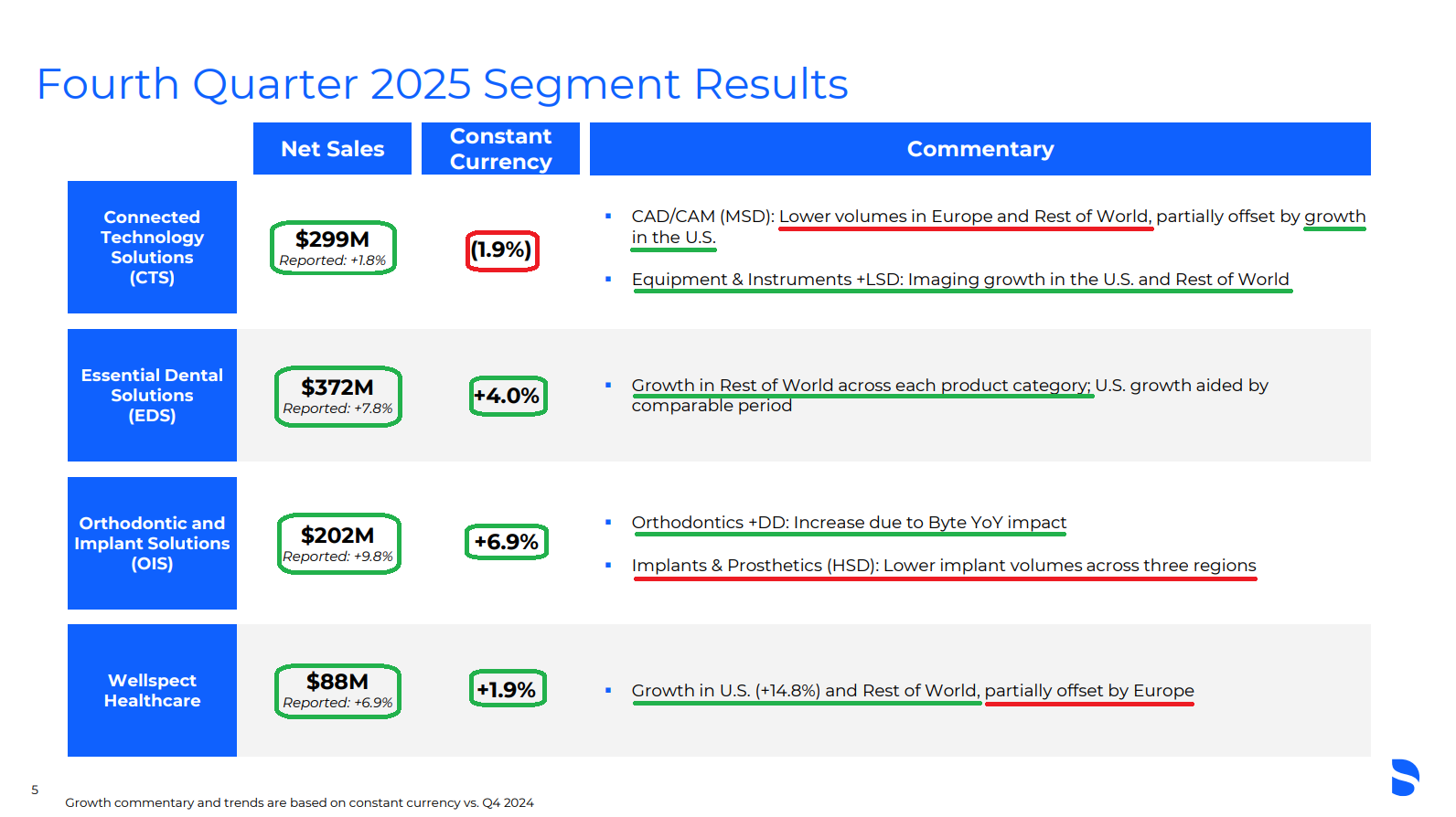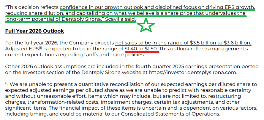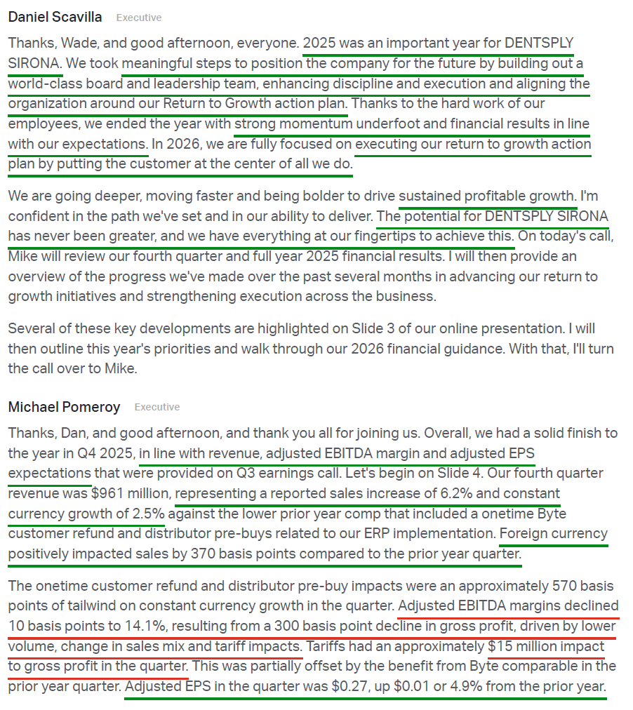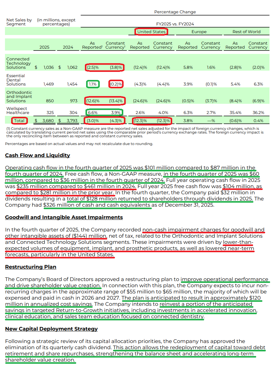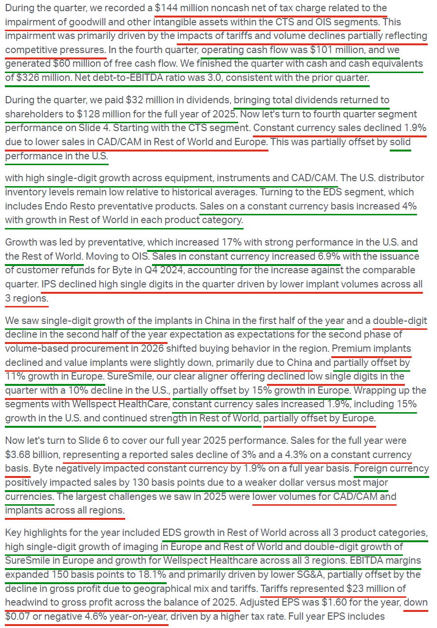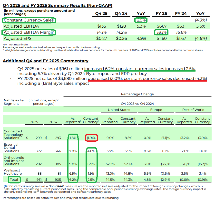 1) XRAY posted 4Q revenue of $961M (+6.2% reported, +2.5% constant currency), beating consensus of ~$926M and bringing FY25 revenue to $3.68B (-3% reported, -4.3% constant currency), at the high end of the $3.6B–$3.7B guidance range. At the segment level, Wellspect Healthcare led the way (+6.6% reported, +3.9% constant currency), while Orthodontic & Implant Solutions remained the key drag (-12.6% reported, -13.4% constant currency). 4Q adjusted EPS of $0.27 (+4.9% Y/Y) came in slightly below consensus of ~$0.29, with FY25 adjusted EPS of $1.60 (-4.6% Y/Y) landing in line with guidance.