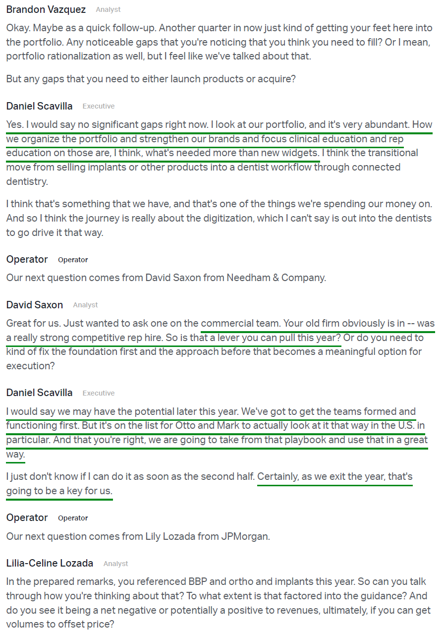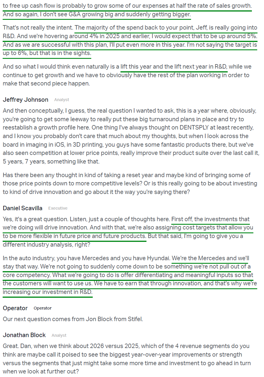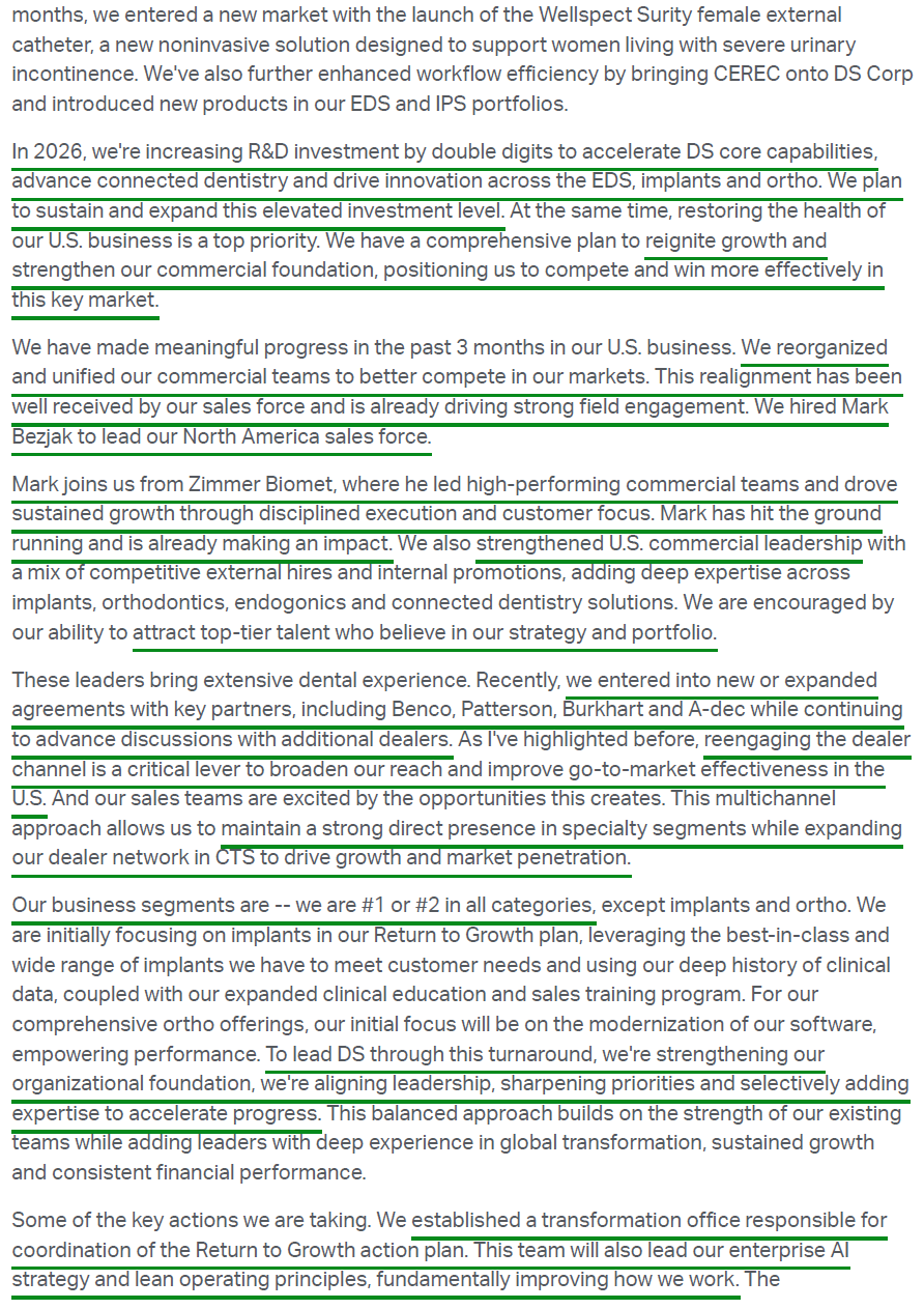 Scavilla is wasting no time making his presence felt, ripping off the band-aid with a multi-pronged plan aimed squarely at restoring profitable growth in the U.S. The turnaround playbook is built around a significant double-digit increase in R&D spend to accelerate innovation, stepping up from ~4% of sales to the 5–6% range, a reorganized commercial team under new proven leadership, and the re-engagement and expansion of key distributor relationships (Patterson, Benco, Burkhart, A-dec, etc.) that prior management had cut ties with.