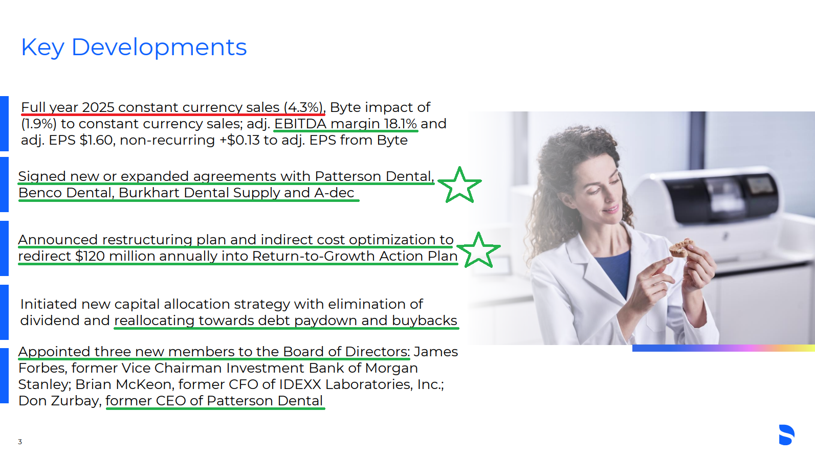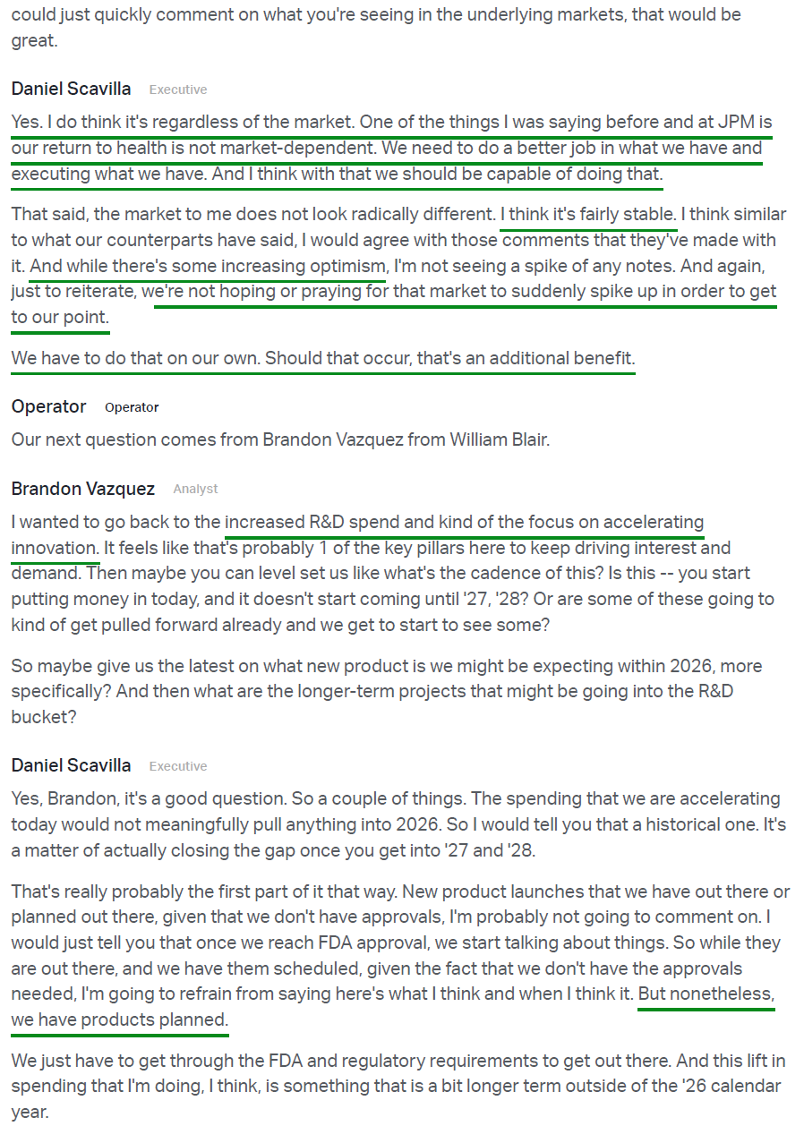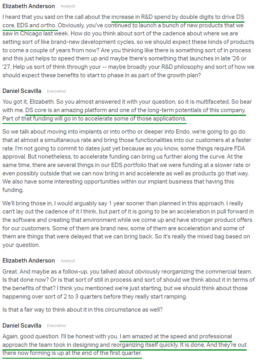 Scavilla is wasting no time making his presence felt, ripping off the band-aid with a multi-pronged plan aimed squarely at restoring profitable growth in the U.S. The turnaround playbook is built around a significant double-digit increase in R&D spend to accelerate innovation, stepping up from ~4% of sales to the 5–6% range, a reorganized commercial team under new proven leadership, and the re-engagement and expansion of key distributor relationships (Patterson, Benco, Burkhart, A-dec, etc.) that prior management had cut ties with.
