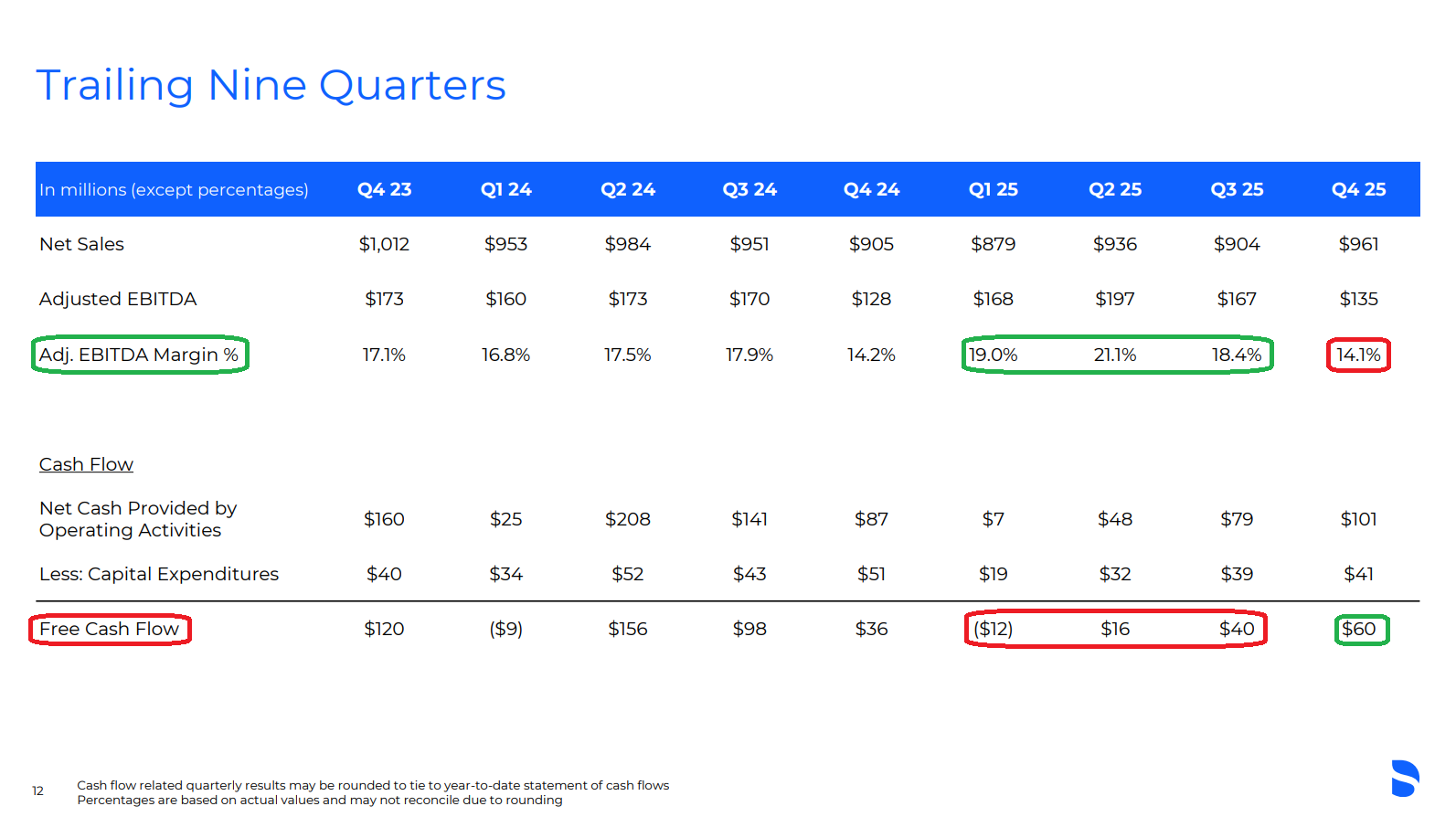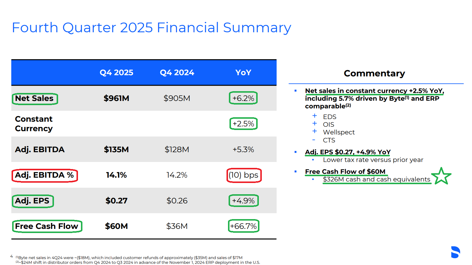2) Gross margin in 4Q came in at 46.2%, down 300 bps Y/Y (vs. 49.2%), pressured by lower volume and a ~$15M tariff headwind. For FY25, gross margin declined 160 bps to 50.0% (vs. 51.6%), with similar drivers of lower volume and a ~$23M tariff headwind. Adjusted EBITDA margin declined 10 bps to 14.1% in 4Q, while FY25 adjusted EBITDA margin improved 150 bps to 18.1%. Looking ahead, management is targeting expense growth at half the rate of top line growth, positioning the business for strong operating leverage as the recovery takes hold.