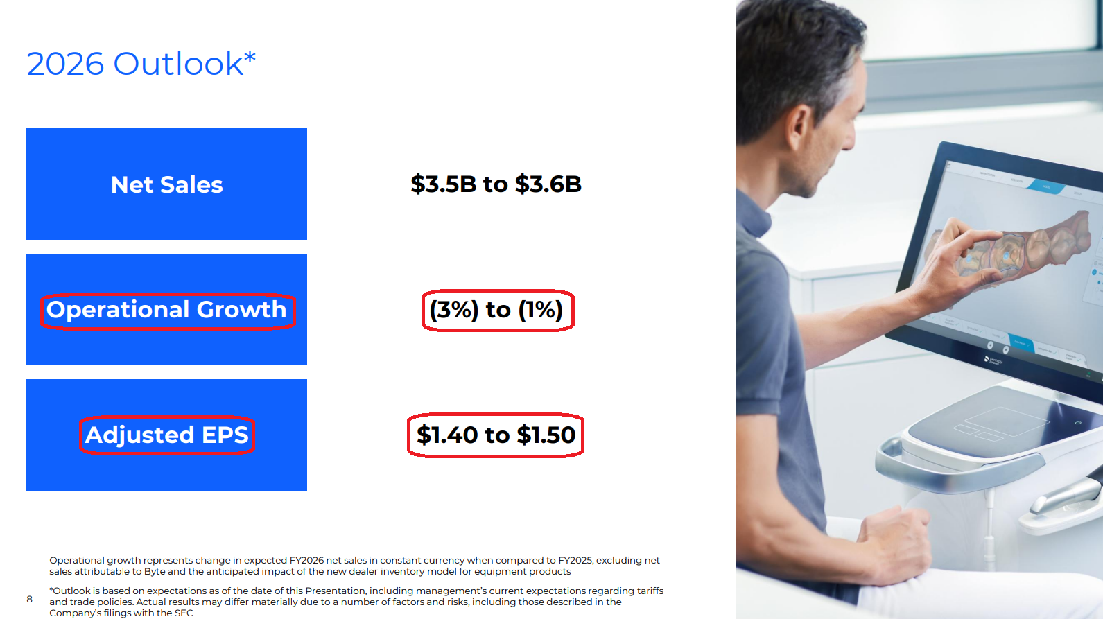 10) For FY26, management guided net sales of $3.5B to $3.6B, with operational sales growth of -3% to -1%, excluding a -2.1% Byte headwind and a ~$30M one-time dealer capital equipment sell-through headwind. Management expects market conditions to remain relatively stable throughout the year, with any improvement representing additional upside and the return to growth in 4Q driven purely by internal execution. Adjusted EPS is guided to $1.40 to $1.50, with the midpoint representing a ~9% decline Y/Y.