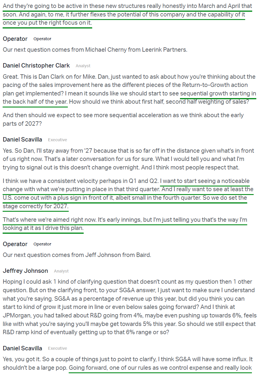 5) Management announced a restructuring plan and indirect cost optimization program targeting $120M in annual savings to be redirected into return to growth initiatives. The program is expected to result in non-recurring charges of $55M to $65M, the majority of which will be cash expenses recognized in FY26 and FY27. Key drivers of the ~$120M in annual savings include building a faster, more scalable, and more profitable manufacturing and distribution network through resource consolidation, standardized packaging, and advanced planning and forecasting tools aimed at improving working capital and reducing product cost.