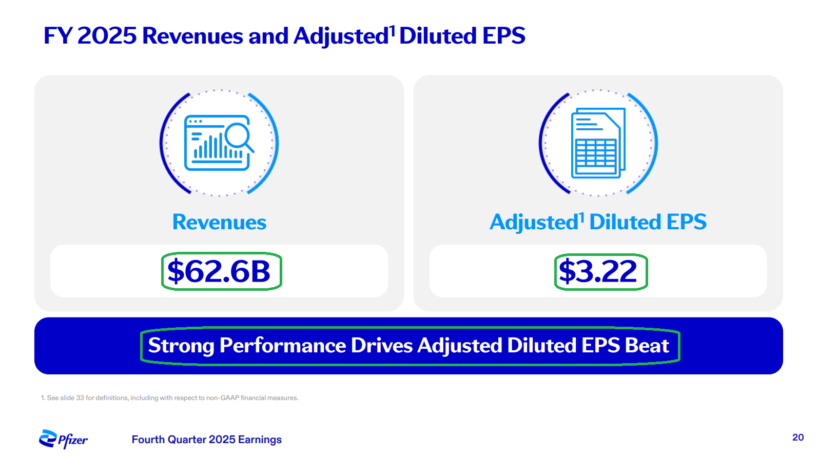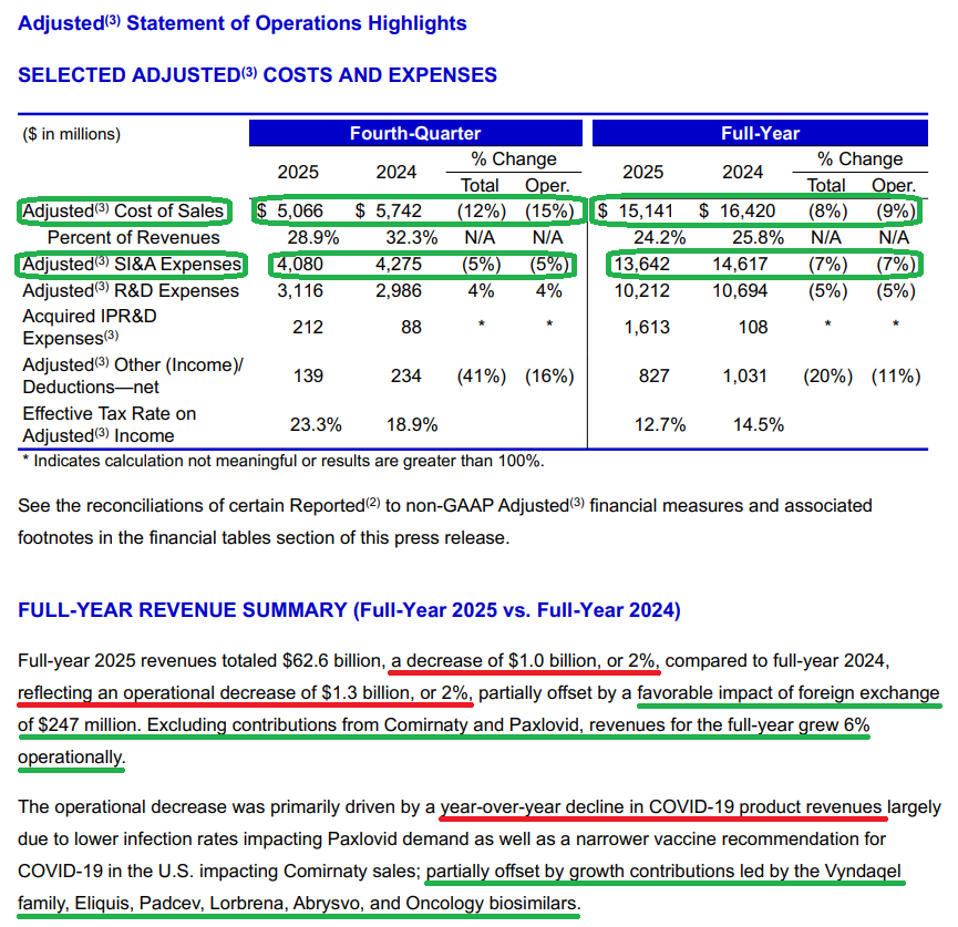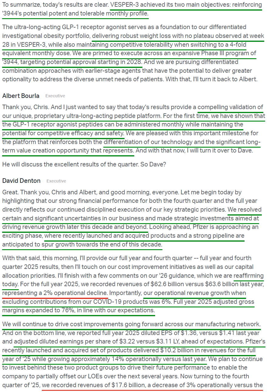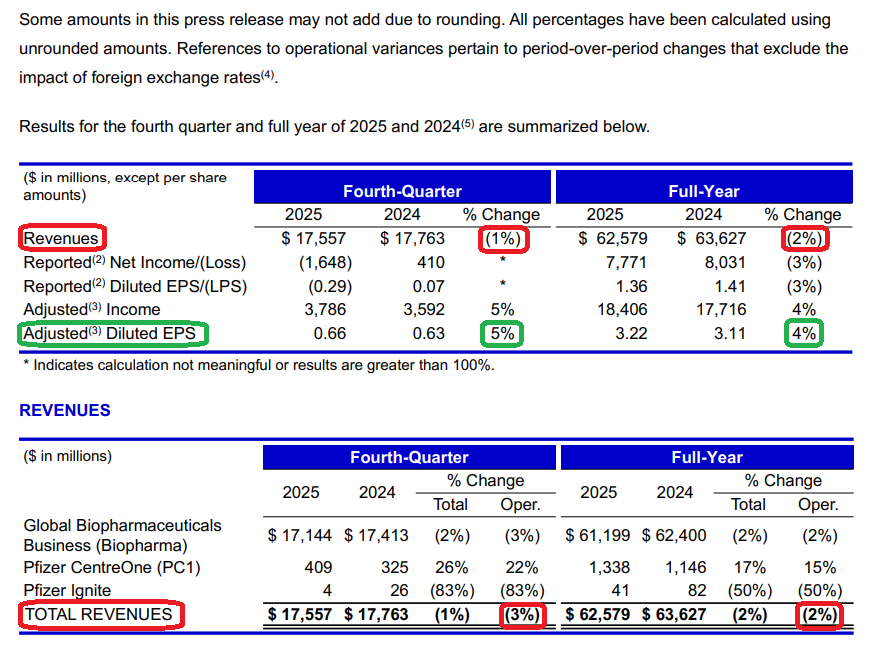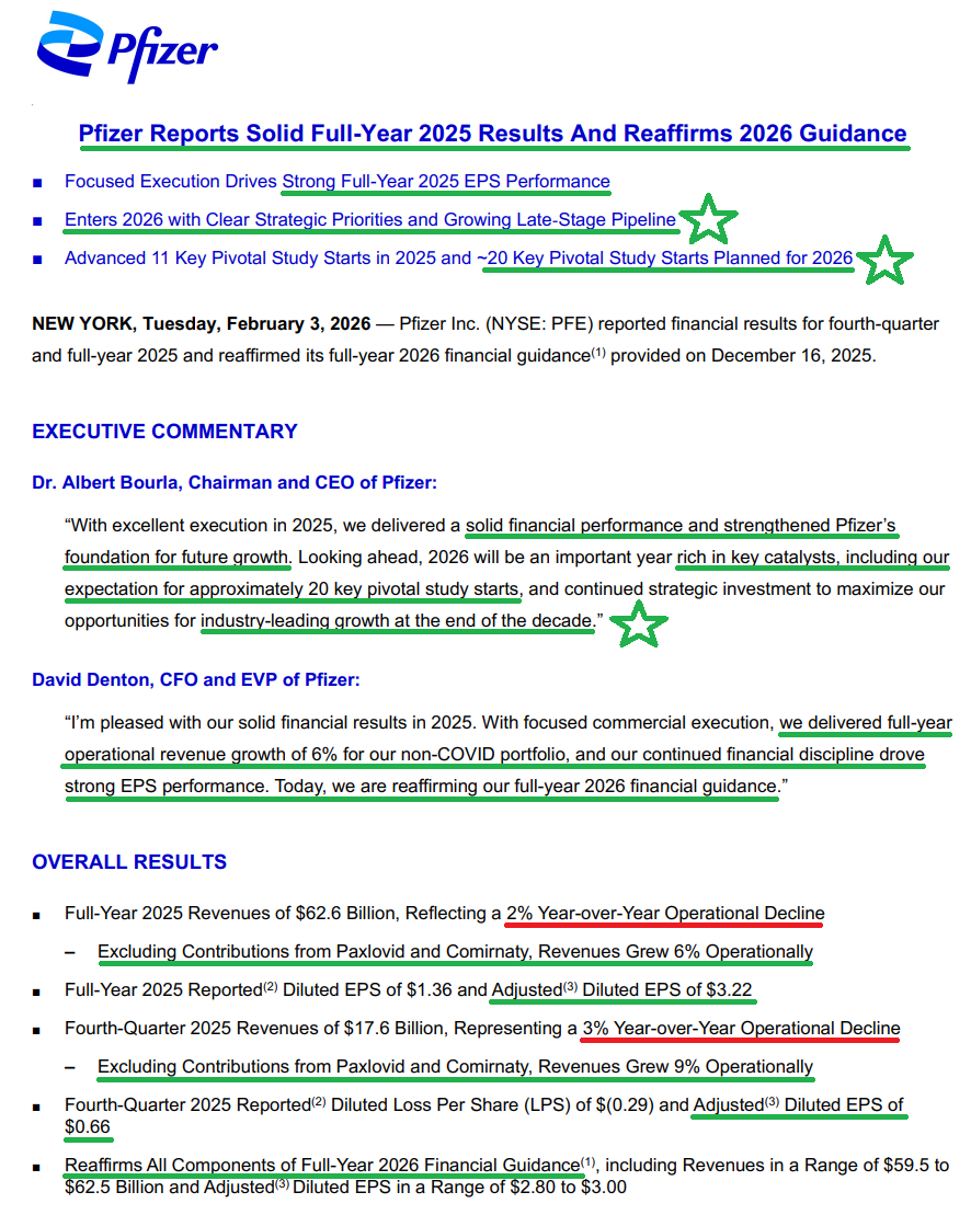 1) Pfizer posted 4Q revenue of $17.6B (-3% Y/Y operationally, +9% ex-COVID products), ahead of consensus of $16.9B. Full year revenue came in at $62.6B (-2% operationally, +6% ex-COVID products), ahead of prior guidance of $62B. 4Q adjusted EPS of $0.66 (+5% Y/Y) beat expectations of $0.57, bringing FY25 adjusted EPS to $3.22 (+4% Y/Y).