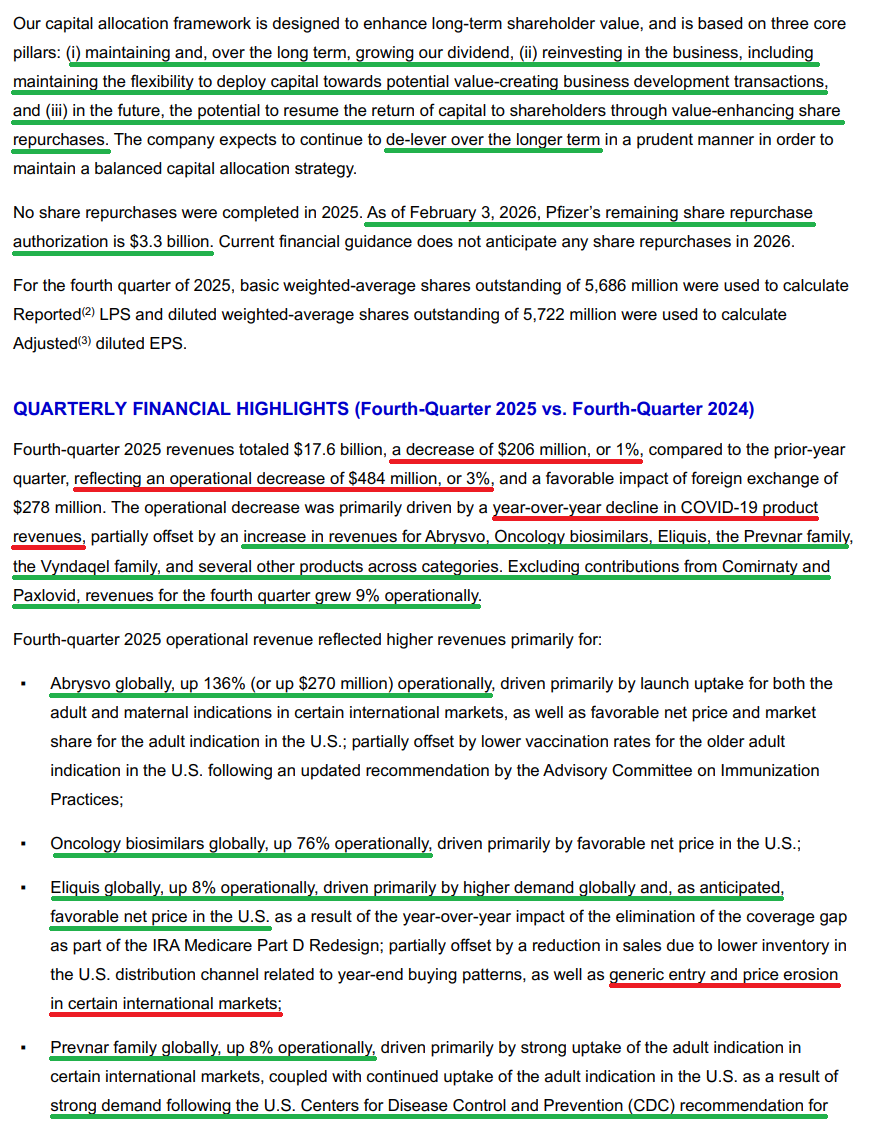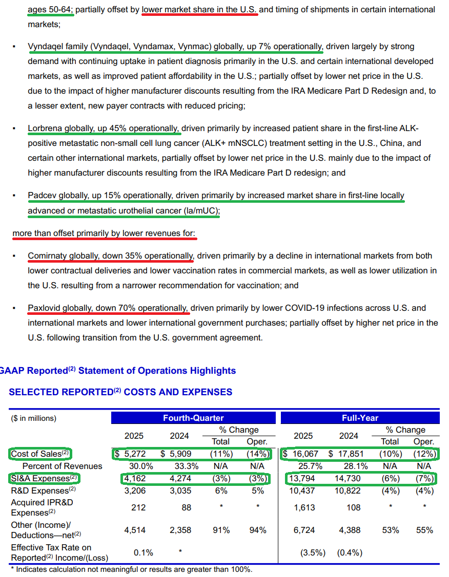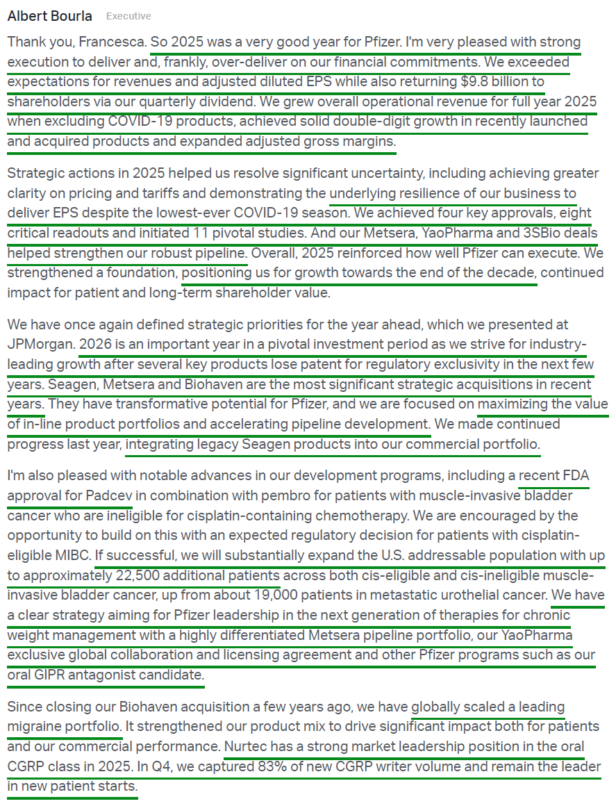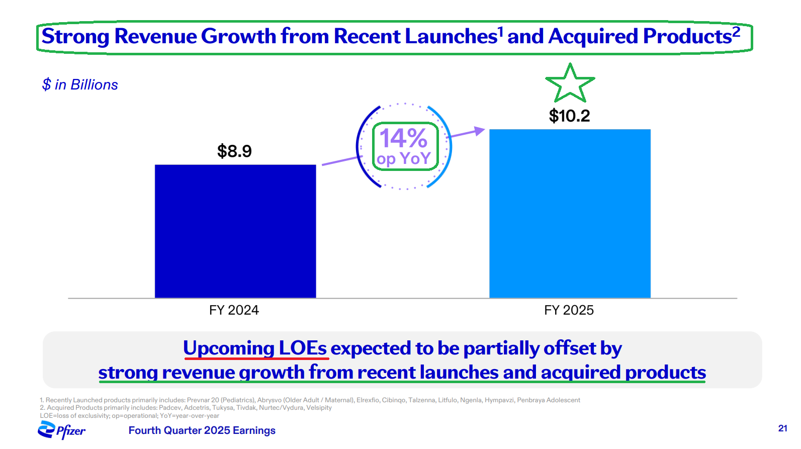 3) Recently launched and acquired products continue to deliver strong growth, with the portfolio growing 14% Y/Y operationally to $10.2B in FY25, helping to cushion the impact of upcoming LOEs through 2028. Some of the key contributors included Padcev (+22% to $1.94B), Abrysvo (+36% to $1.03B), and Nurtec ODT/Vydura (+13% to $1.42B).
