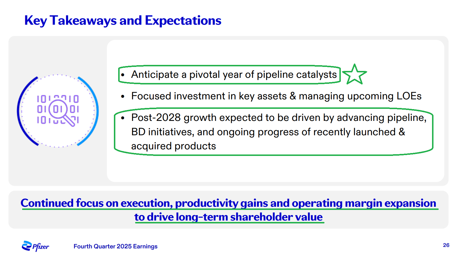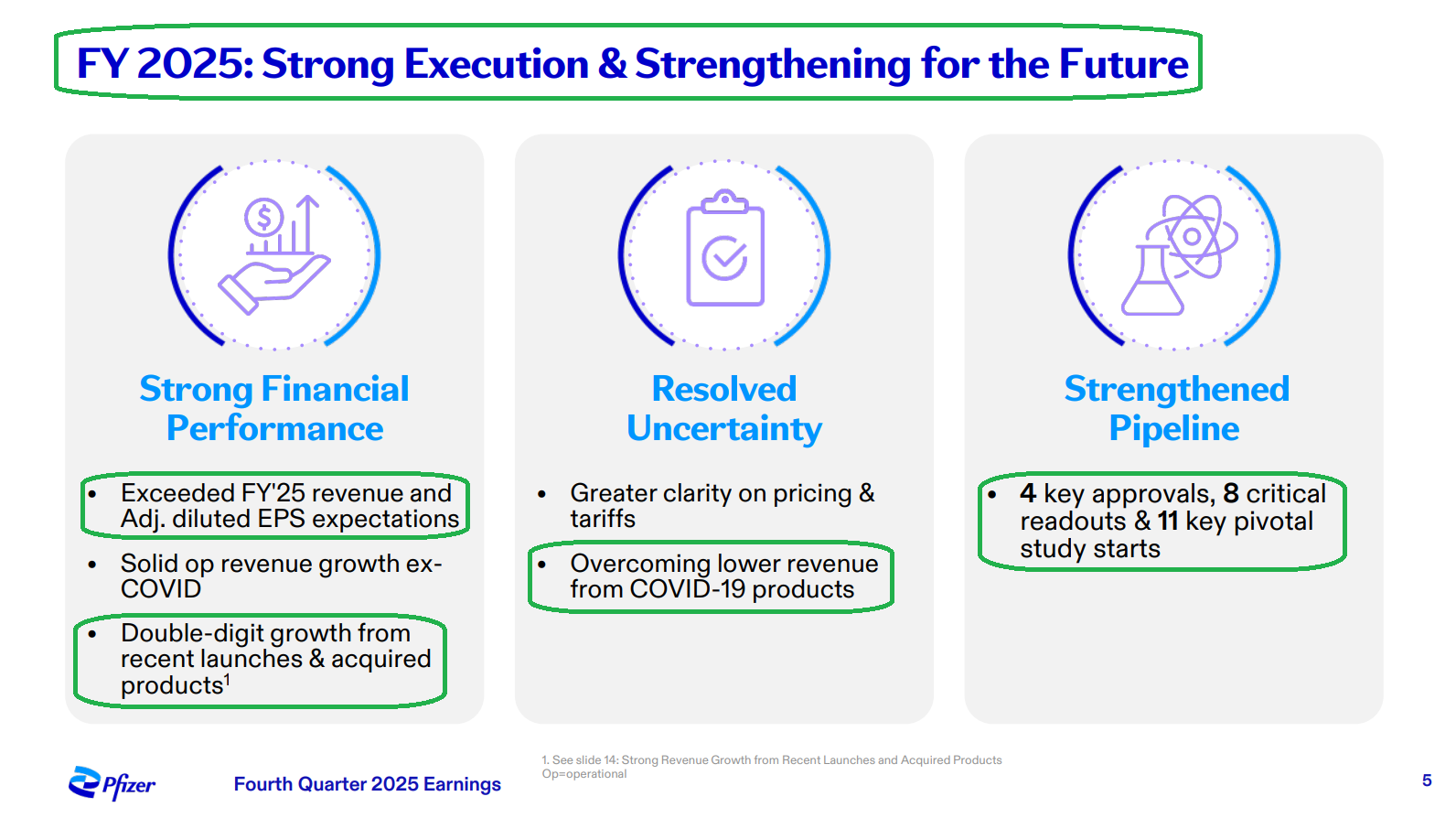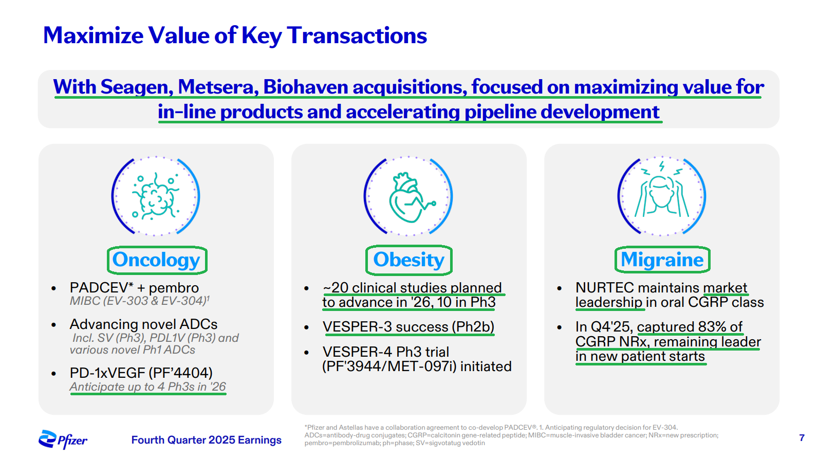 3) Recently launched and acquired products continue to deliver strong growth, with the portfolio growing 14% Y/Y operationally to $10.2B in FY25, helping to cushion the impact of upcoming LOEs through 2028. Some of the key contributors included Padcev (+22% to $1.94B), Abrysvo (+36% to $1.03B), and Nurtec ODT/Vydura (+13% to $1.42B).