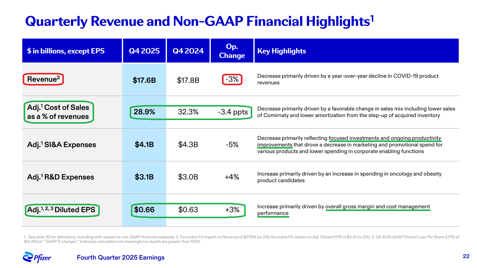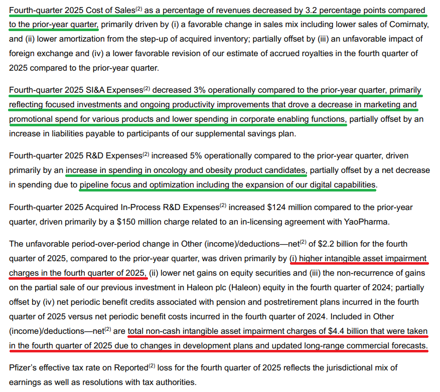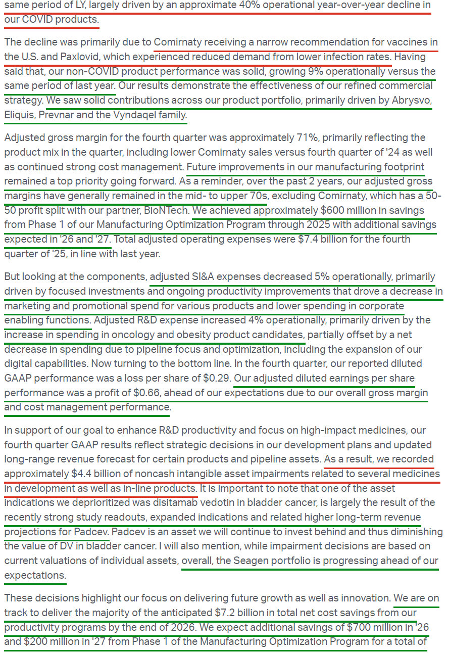 5) COVID-19 product revenue declined further in FY25 to $6.7B (vs. $11B in FY24) as Pfizer experienced its lowest ever COVID-19 season. Comirnaty revenue of $2.3B in 4Q declined 35% operationally, bringing FY25 revenue to $4.4B (-20% Y/Y), while Paxlovid declined 70% operationally in 4Q to just $218M, bringing FY25 revenue to $2.4B (-59% Y/Y). Management expects the COVID franchise to decline further in FY26 to ~$5B, representing just ~8.2% of total sales compared to ~57% at peak in 2022, as Pfizer continues to move past the COVID-driven era.