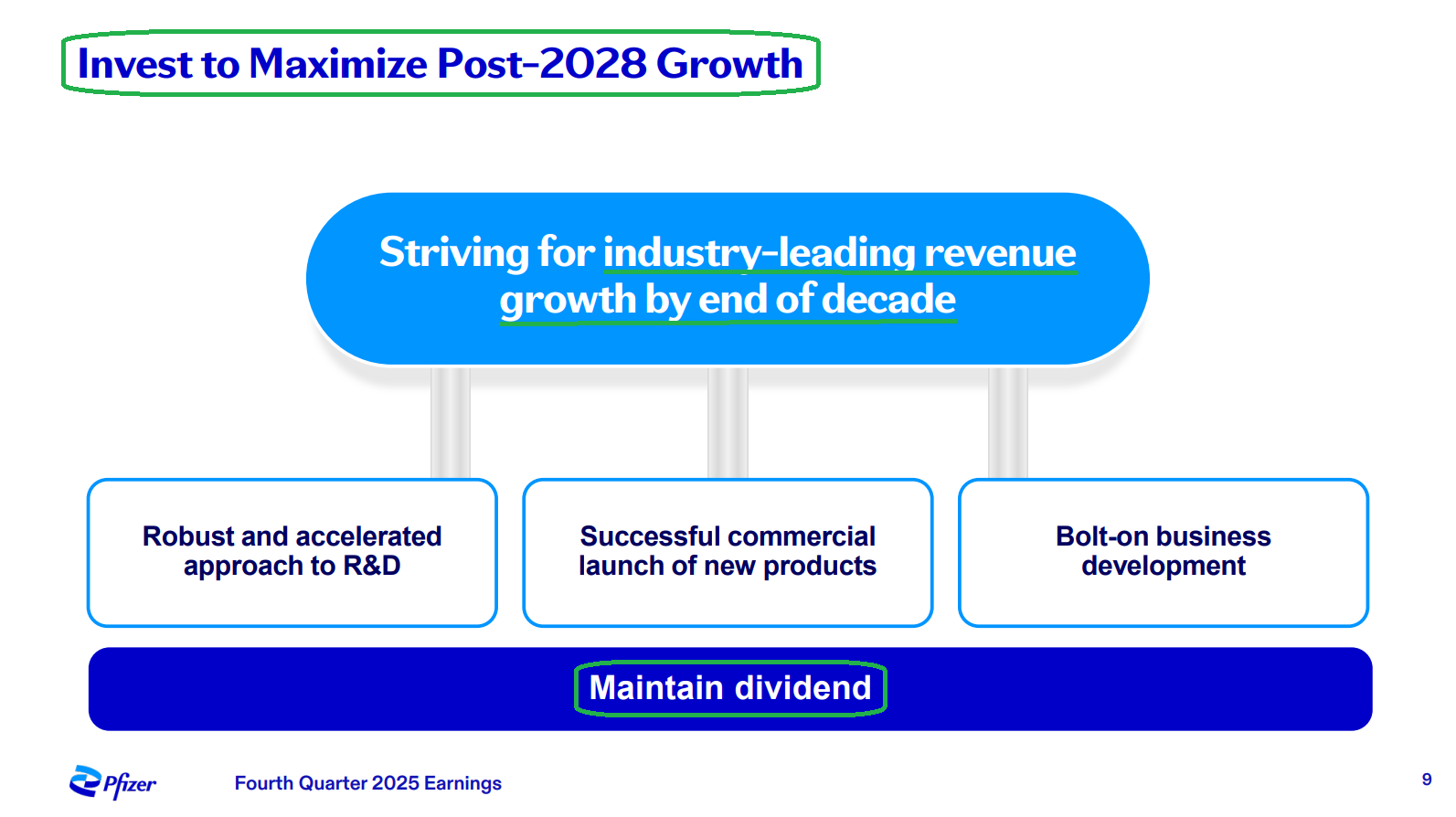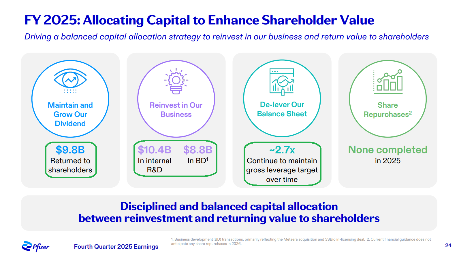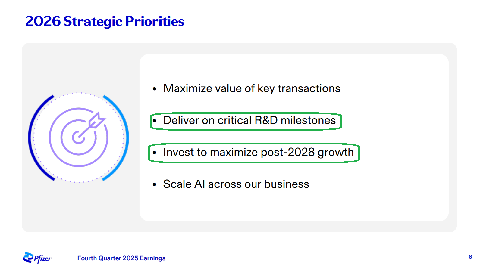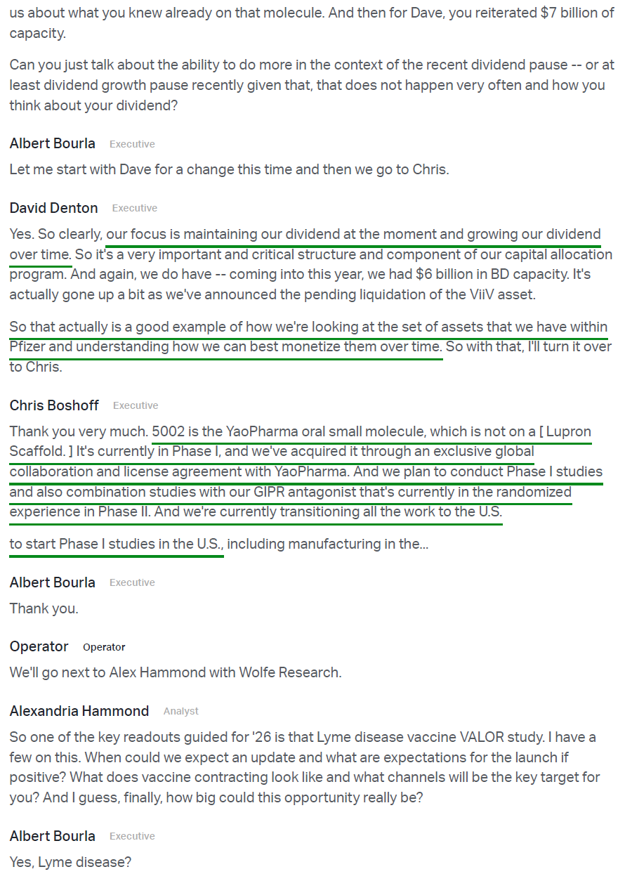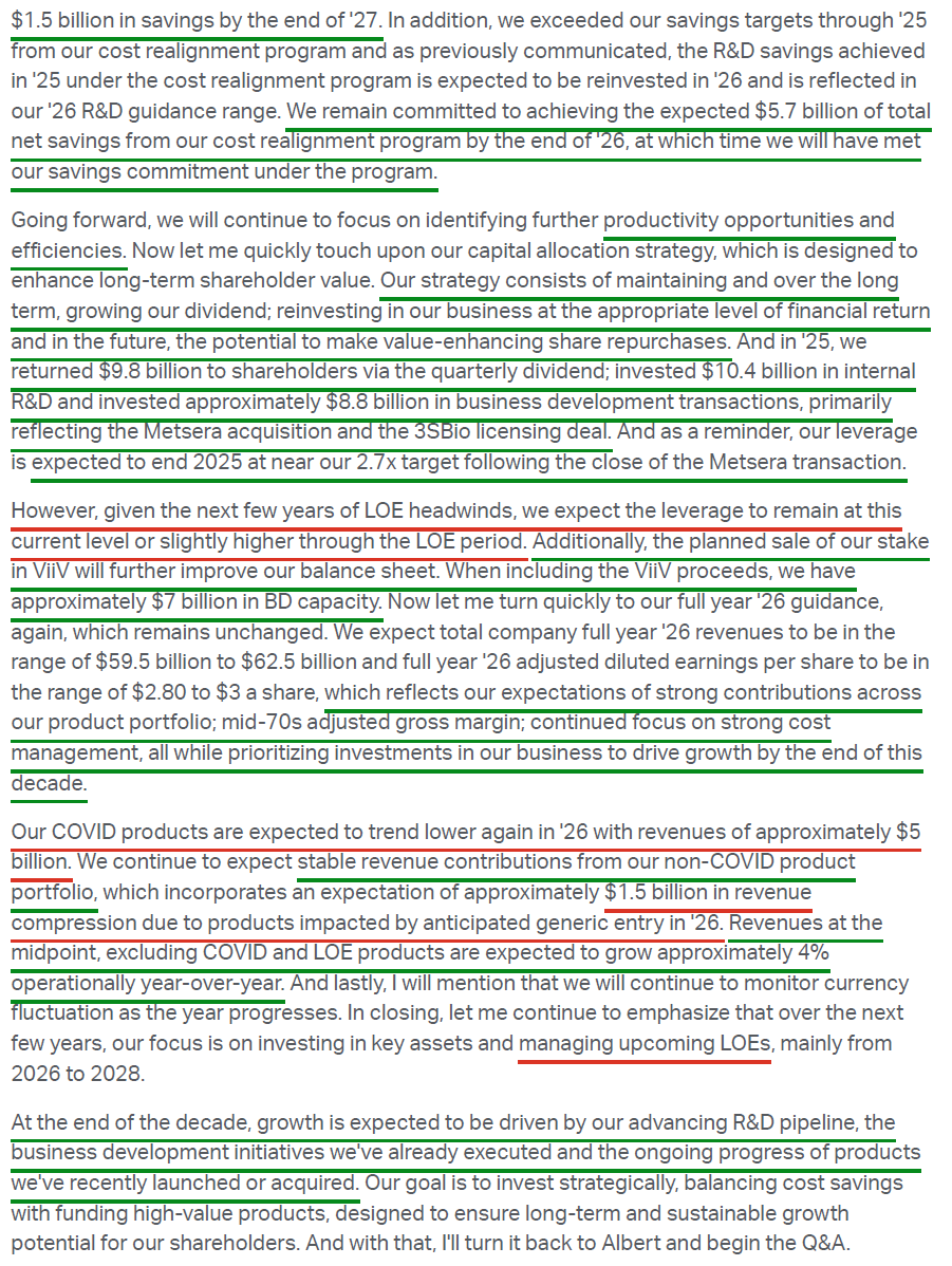 6) PFE continues to build out its pipeline, with $8.8B invested in BD transactions in FY25 (primarily the Metsera and 3SBIO deals), alongside 4 key approvals, 8 critical readouts, and 11 key pivotal study starts. Looking ahead, management is targeting 20 key pivotal study starts in FY26 in what they are calling a “catalyst rich” year, with adjusted R&D expense expected to increase to ~$11B at the midpoint (vs. $10.4B in FY25) as Pfizer invests to maximize post-2028 growth and strives for industry leading growth by the end of the decade.