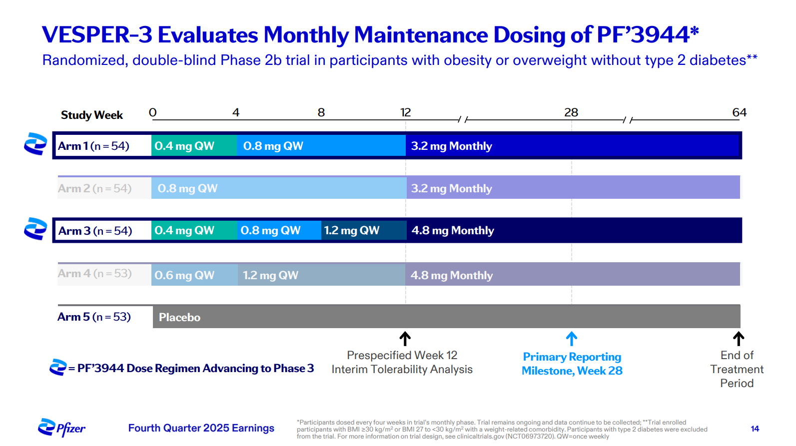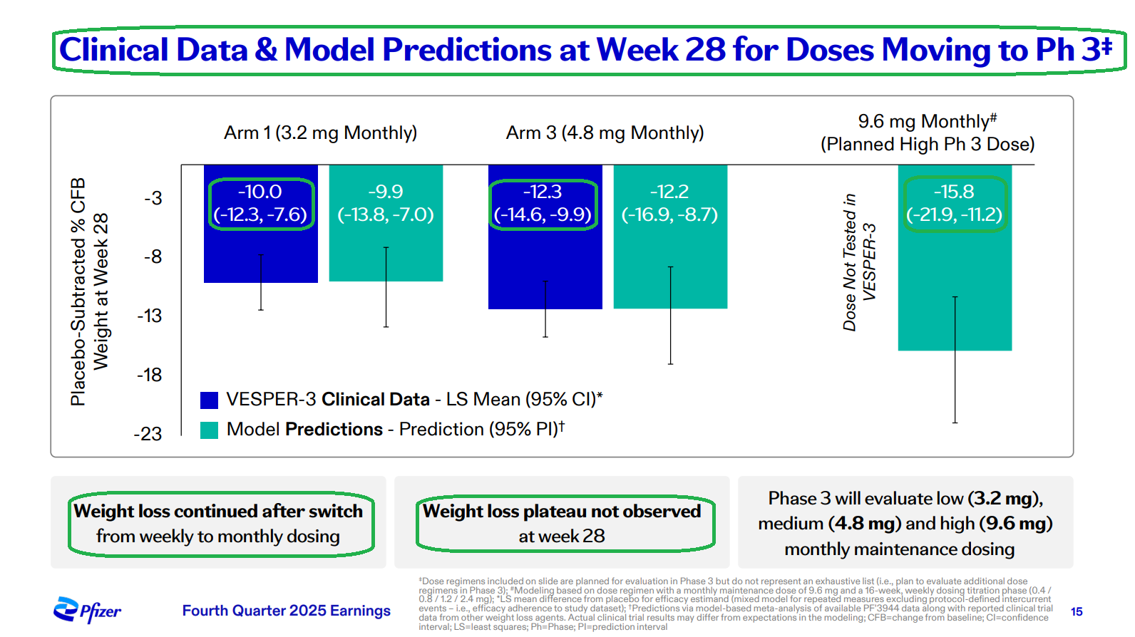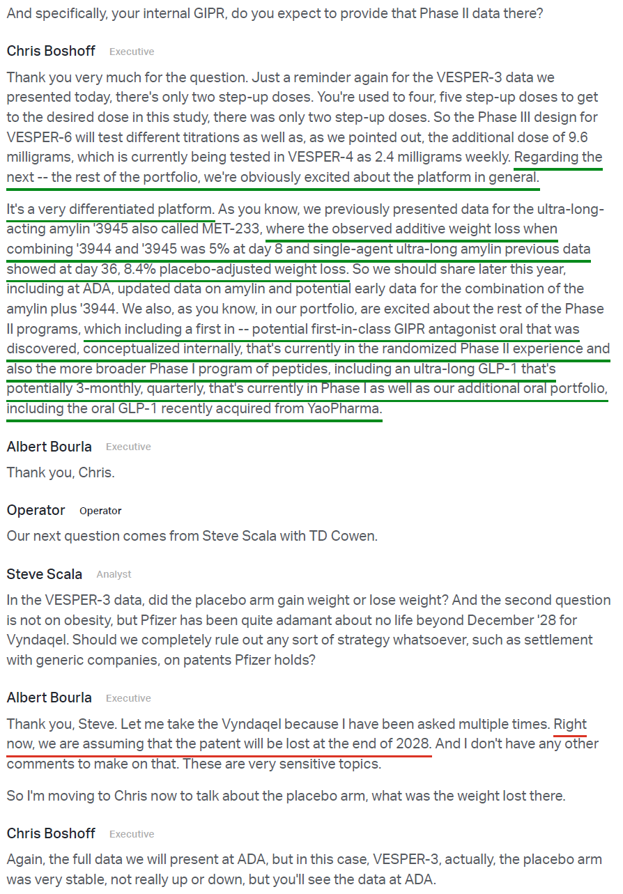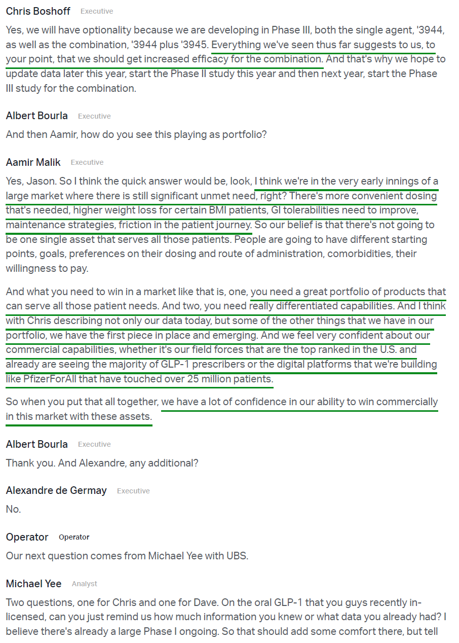 4) The biggest highlight of the earnings release was the announcement of Pfizer’s Phase 2b VESPER-3 study results for PF-3944, its GLP-1 receptor agonist added via the recent $10B acquisition of Metsera. Results were encouraging, with the experimental monthly maintenance dose driving up to 12.3% placebo-adjusted weight loss at 28 weeks with no plateau observed, suggesting continued weight loss is expected as the study progresses through week 64. Pfizer also plans to use a higher dose regime in a planned Phase 3 trial, with models predicting up to 16% weight loss at week 28, alongside a tolerability profile that is potentially best in class. The monthly maintenance dosing format is a key differentiator for PFE, reducing dosing frequency fourfold while maintaining efficacy and a favorable safety profile, a first for the industry. Management plans to advance 20+ obesity trials in FY26, including 10 Phase 3 studies and a highly differentiated potential oral formulation in Phase 2, with Pfizer targeting the first of a series of potential approvals in 2028 in what they see as a $150B market.