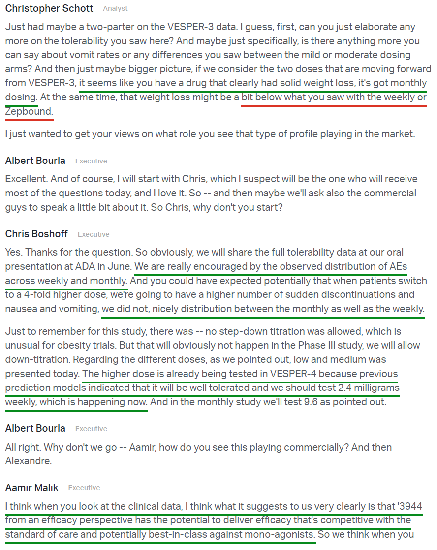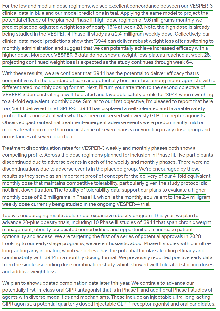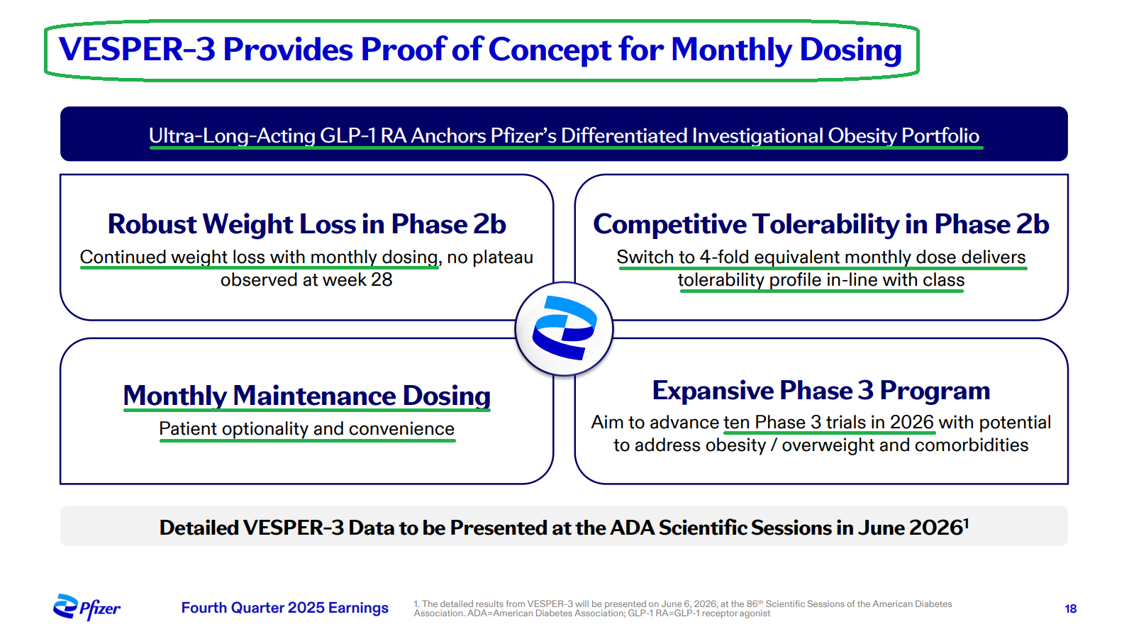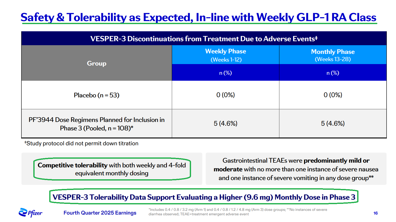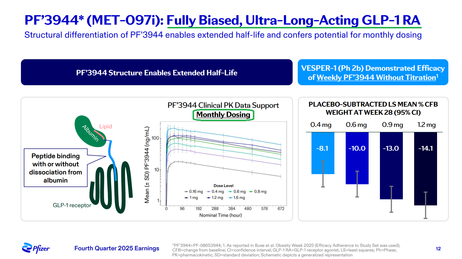 4) The biggest highlight of the earnings release was the announcement of Pfizer’s Phase 2b VESPER-3 study results for PF-3944, its GLP-1 receptor agonist added via the recent $10B acquisition of Metsera. Results were encouraging, with the experimental monthly maintenance dose driving up to 12.3% placebo-adjusted weight loss at 28 weeks with no plateau observed, suggesting continued weight loss is expected as the study progresses through week 64. Pfizer also plans to use a higher dose regime in a planned Phase 3 trial, with models predicting up to 16% weight loss at week 28, alongside a tolerability profile that is potentially best in class. The monthly maintenance dosing format is a key differentiator for PFE, reducing dosing frequency fourfold while maintaining efficacy and a favorable safety profile, a first for the industry. Management plans to advance 20+ obesity trials in FY26, including 10 Phase 3 studies and a highly differentiated potential oral formulation in Phase 2, with Pfizer targeting the first of a series of potential approvals in 2028 in what they see as a $150B market.