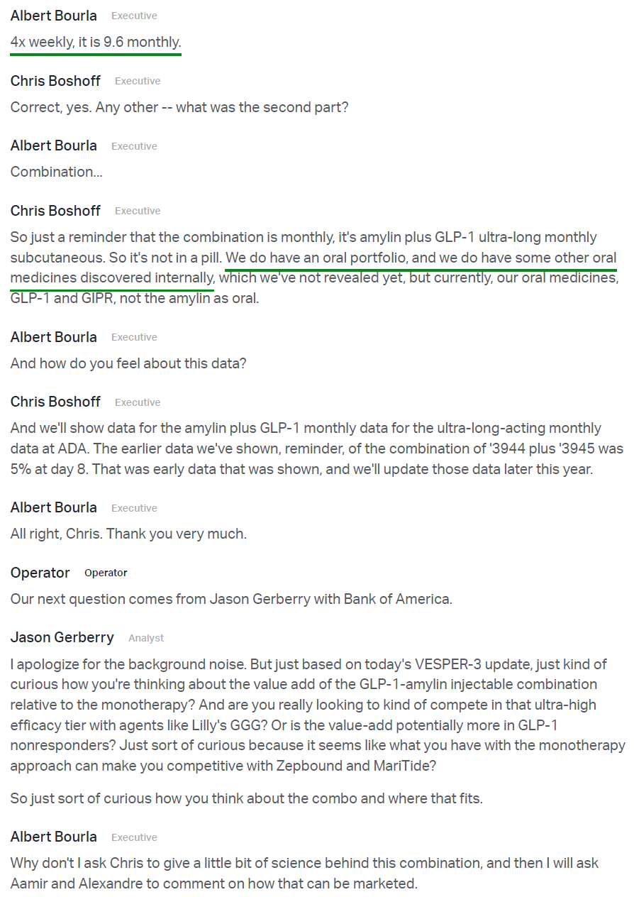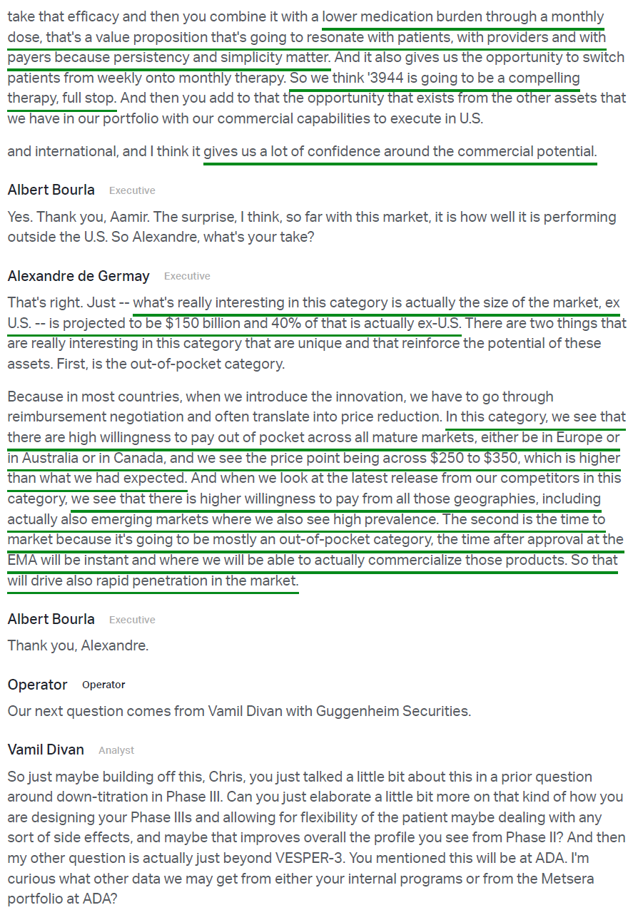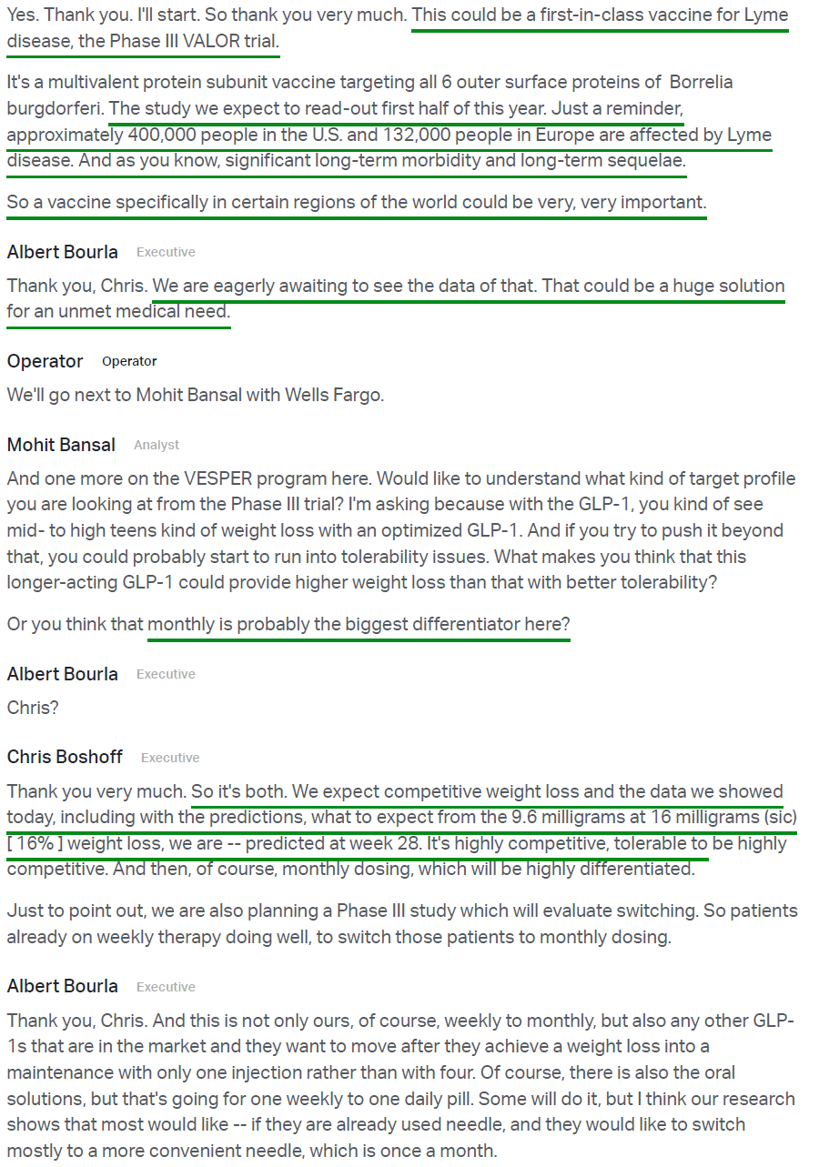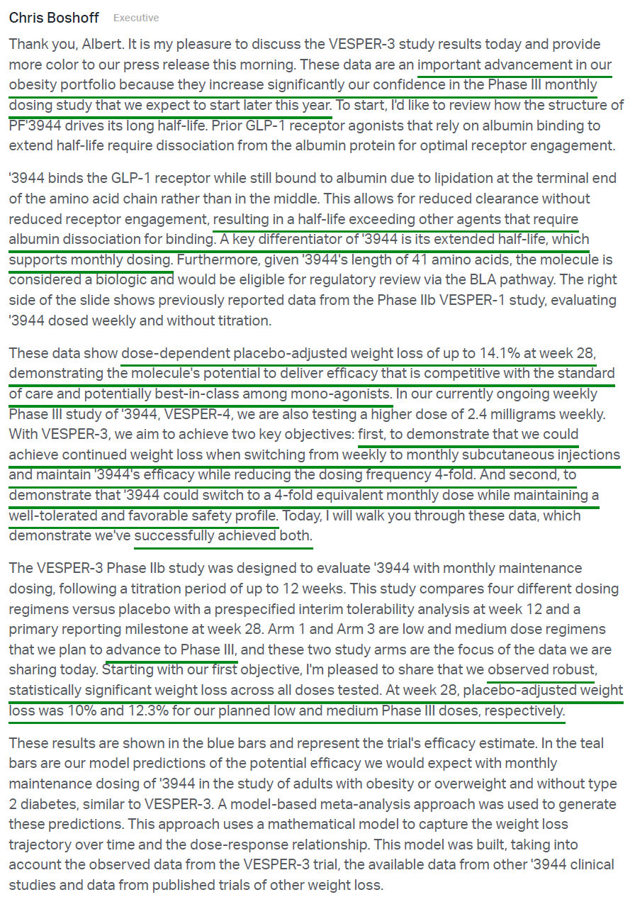 4) The biggest highlight of the earnings release was the announcement of Pfizer’s Phase 2b VESPER-3 study results for PF-3944, its GLP-1 receptor agonist added via the recent $10B acquisition of Metsera. Results were encouraging, with the experimental monthly maintenance dose driving up to 12.3% placebo-adjusted weight loss at 28 weeks with no plateau observed, suggesting continued weight loss is expected as the study progresses through week 64. Pfizer also plans to use a higher dose regime in a planned Phase 3 trial, with models predicting up to 16% weight loss at week 28, alongside a tolerability profile that is potentially best in class. The monthly maintenance dosing format is a key differentiator for PFE, reducing dosing frequency fourfold while maintaining efficacy and a favorable safety profile, a first for the industry. Management plans to advance 20+ obesity trials in FY26, including 10 Phase 3 studies and a highly differentiated potential oral formulation in Phase 2, with Pfizer targeting the first of a series of potential approvals in 2028 in what they see as a $150B market.
