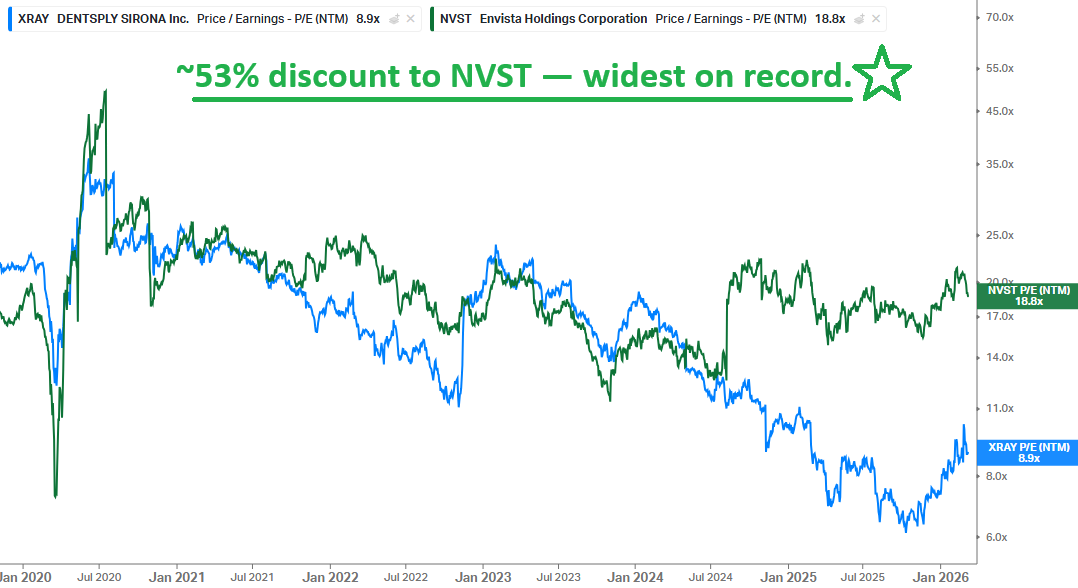 While the market is warming up to the Scavilla playbook, consensus remains firmly in show-me mode, with growth expectations still depressed at just 2% from FY27 to FY29. Even with the recent move higher, XRAY is still trading at a 50%+ discount to top competitor Envista, the widest gap on record and one we expect to narrow.