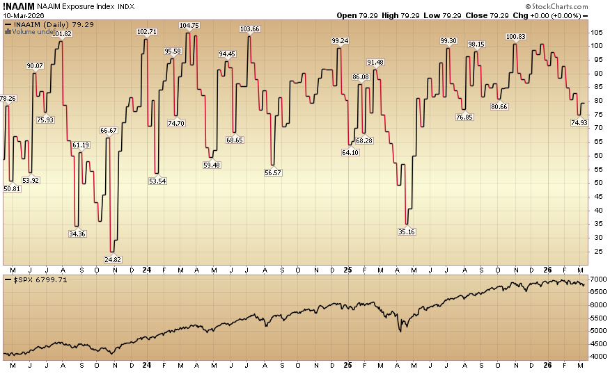 The NAAIM (National Association of Active Investment Managers Index) (Video Explanation) rose to 79.29% equity exposure this week from last week’s 74.93%.