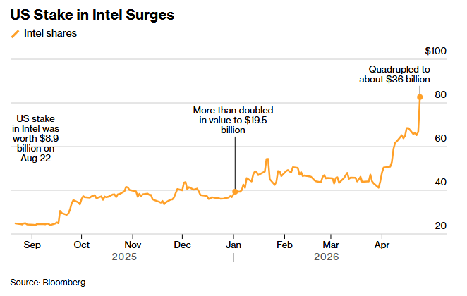 - US Government Stake in Intel Has Jumped 300% to $36 Billion (bloomberg)