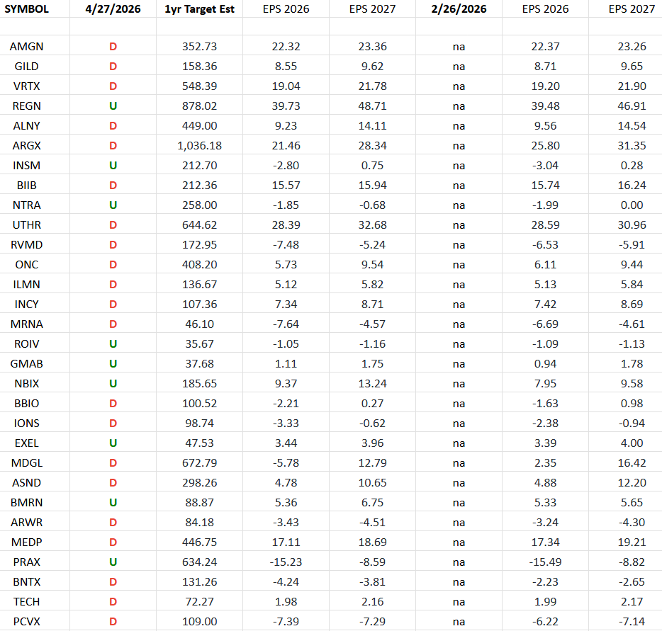 In the spreadsheet above I have tracked the earnings estimates for the Biotech ETF (IBB) top 30 holdings.