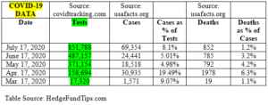 From April 17, 2020 (when testing infrastructure was fully up and running) to July 17, 2020, COVID-19 testing is up ~436%. Over the same dates, cases are up only ~124%. While it is correct to say we have “record cases,” it pales in comparison to the growth of “record testing.” What is even more noteworthy … Continue reading COVID-19 Data/Testing (and commentary)…