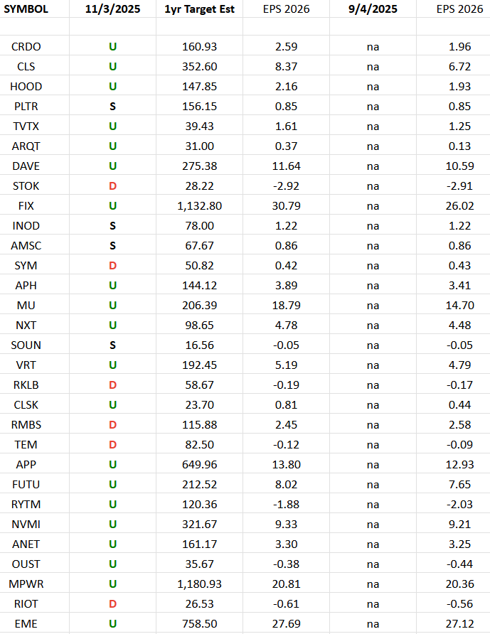 I have columns for what the 2026 estimates were on 9/4/2025 and today. The column under the date 11/3/2025 has a letter that represents the movement in 2026 earnings estimates since the most recent print (9/4/2025). “U” means 2026 estimates are UP in the last 60 days. “D” means 2026 estimates are DOWN in the last 60 days. “S” means 2026 estimates have remained the SAME in the last 60 days. The column entitled “1yr Target Est” is the Wall Street consensus 12 month price target for each stock.