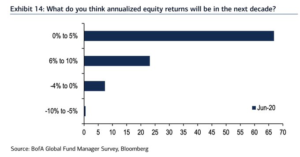 Data Source: Bank of America Bank of America surveyed 212 mutual fund, hedge fund and pension fund managers with $598 billion under management during the week ending June 11. OUTLOOK: 53% say the comeback from the March lows is a “bear market rally.” 37% believe it’s a new bull market. Only 18% of investors expect … Continue reading June Bank of America Global Fund Manager Survey Results (Summary)