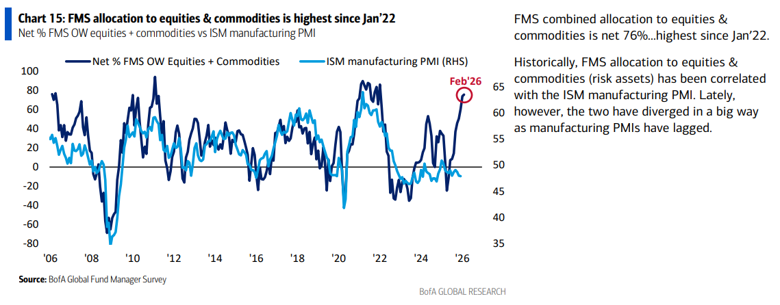 2) Fund managers’ combined allocation to equities and commodities sits at a net 76% overweight (highest since January 2022). Historically, elevated exposure to risk assets (equities + commodities) has moved closely with ISM Manufacturing PMI, which is now emerging from one of the longest downturns in modern history (>2 years in contraction). The latest print (post BofA survey) rose 4.7 points to 52.6, the strongest expansion since 2022. If ISM catches up to where positioning already stands, the cyclical recovery has room to run MATERIALLY higher = green light for small caps and cyclicals.