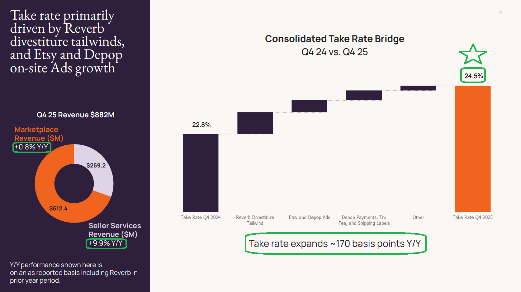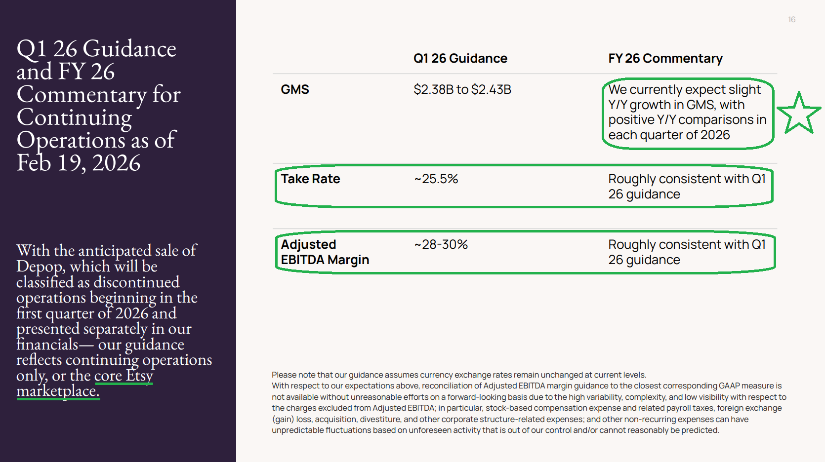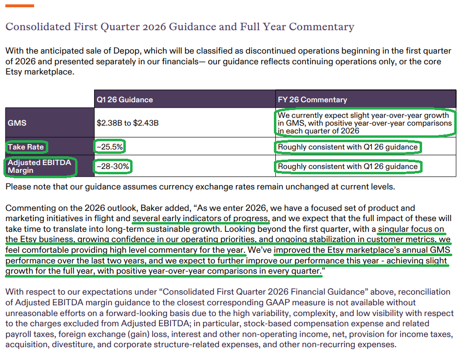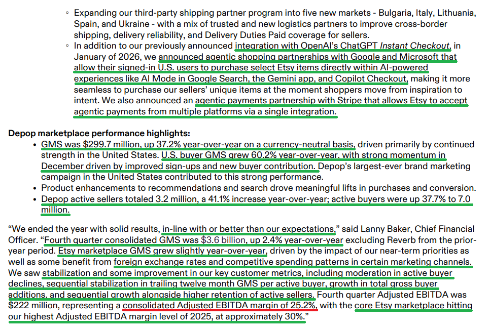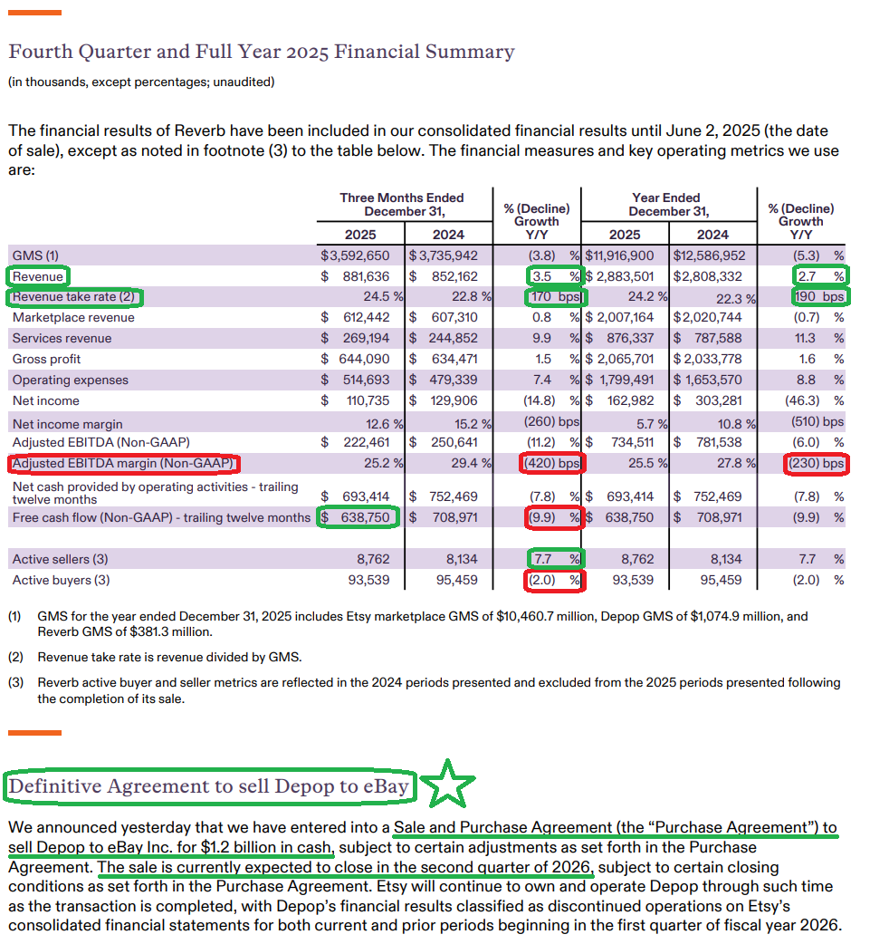 3) Prior to earnings, Etsy announced the sale of Depop to eBay for ~$1.2B in cash, with the transaction expected to close in Q2 2026. Depop grew rapidly in FY25, generating ~$1.1B of GMS (+36.3% Y/Y), but it was a significant headwind to profitability, representing a 350 bps drag on adjusted EBITDA margins, while its structurally lower take rate reduced consolidated take rate by 80 bps in 2025. Etsy acquired Depop in 2021 for $1.62B (~23x sales), and the ~$1.05B impairment taken in 2022 confirmed the overpayment. The ~$1.2B sale price represents a ~$420M haircut to the original purchase price, yet still equates to ~6.4x sales and more than 25% of Etsy’s current market cap for a business that accounted for just 9% of 2025 GMS, with proceeds targeted toward buybacks and reinvestment in the core marketplace.