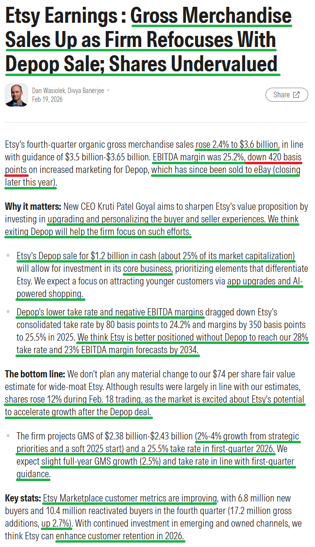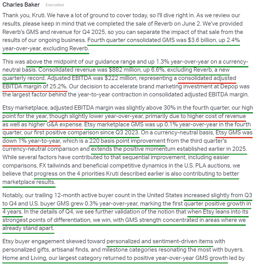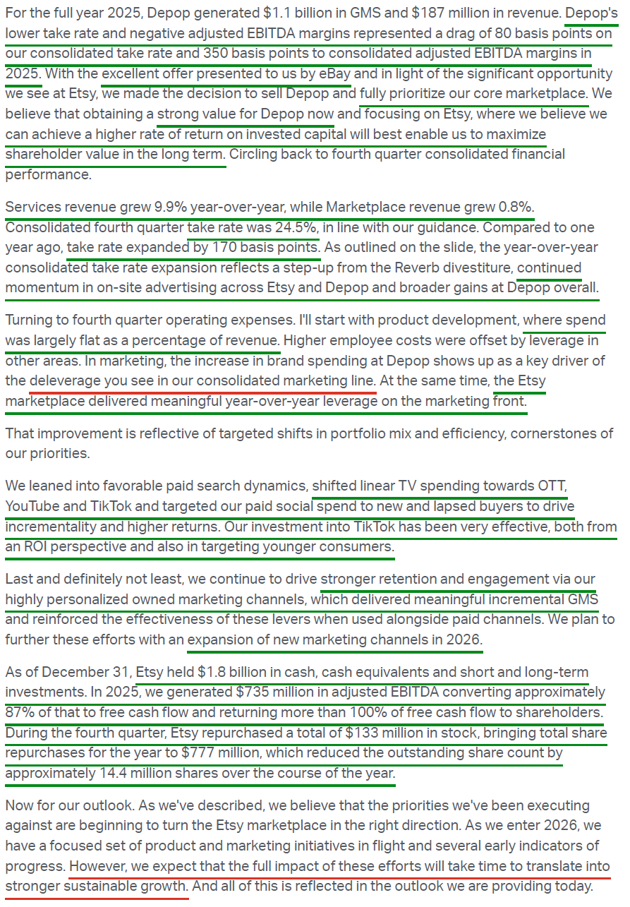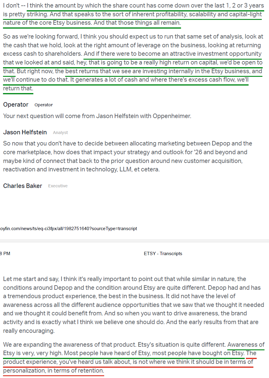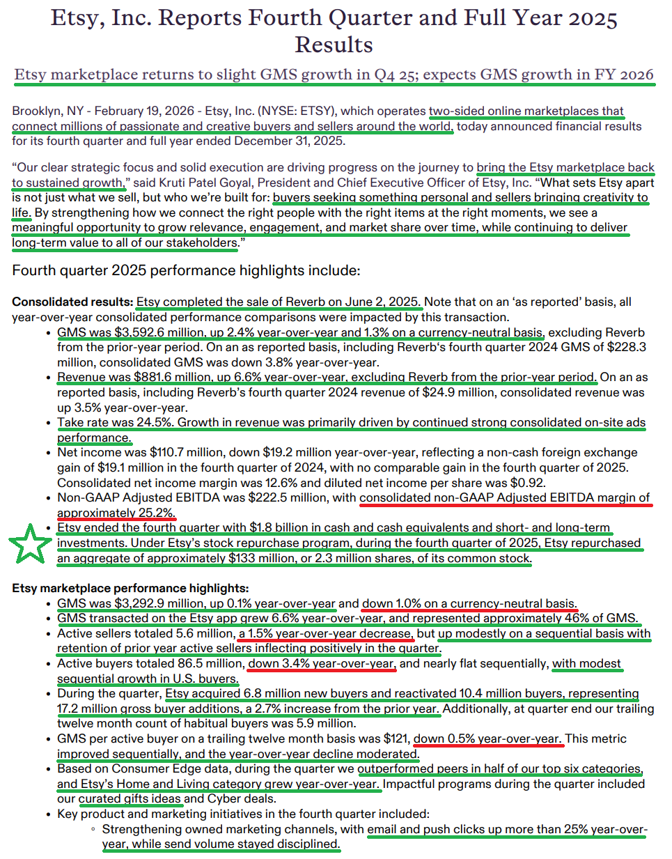 3) Prior to earnings, Etsy announced the sale of Depop to eBay for ~$1.2B in cash, with the transaction expected to close in Q2 2026. Depop grew rapidly in FY25, generating ~$1.1B of GMS (+36.3% Y/Y), but it was a significant headwind to profitability, representing a 350 bps drag on adjusted EBITDA margins, while its structurally lower take rate reduced consolidated take rate by 80 bps in 2025. Etsy acquired Depop in 2021 for $1.62B (~23x sales), and the ~$1.05B impairment taken in 2022 confirmed the overpayment. The ~$1.2B sale price represents a ~$420M haircut to the original purchase price, yet still equates to ~6.4x sales and more than 25% of Etsy’s current market cap for a business that accounted for just 9% of 2025 GMS, with proceeds targeted toward buybacks and reinvestment in the core marketplace.