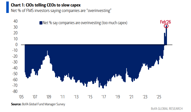 4) A record high share of FMS investors now believe companies are overinvesting, with a net 35% saying capex is too high versus 26% last month. The asset light model that once defined big tech’s dominance has shifted to a capital intensive arms race, with capex now consuming more than 60% of operating cash flow, levels on par with big oil and tracking toward 92% in 2026. Investors are no longer blindly applauding the spend and are beginning to ask where the R is in ROIC.