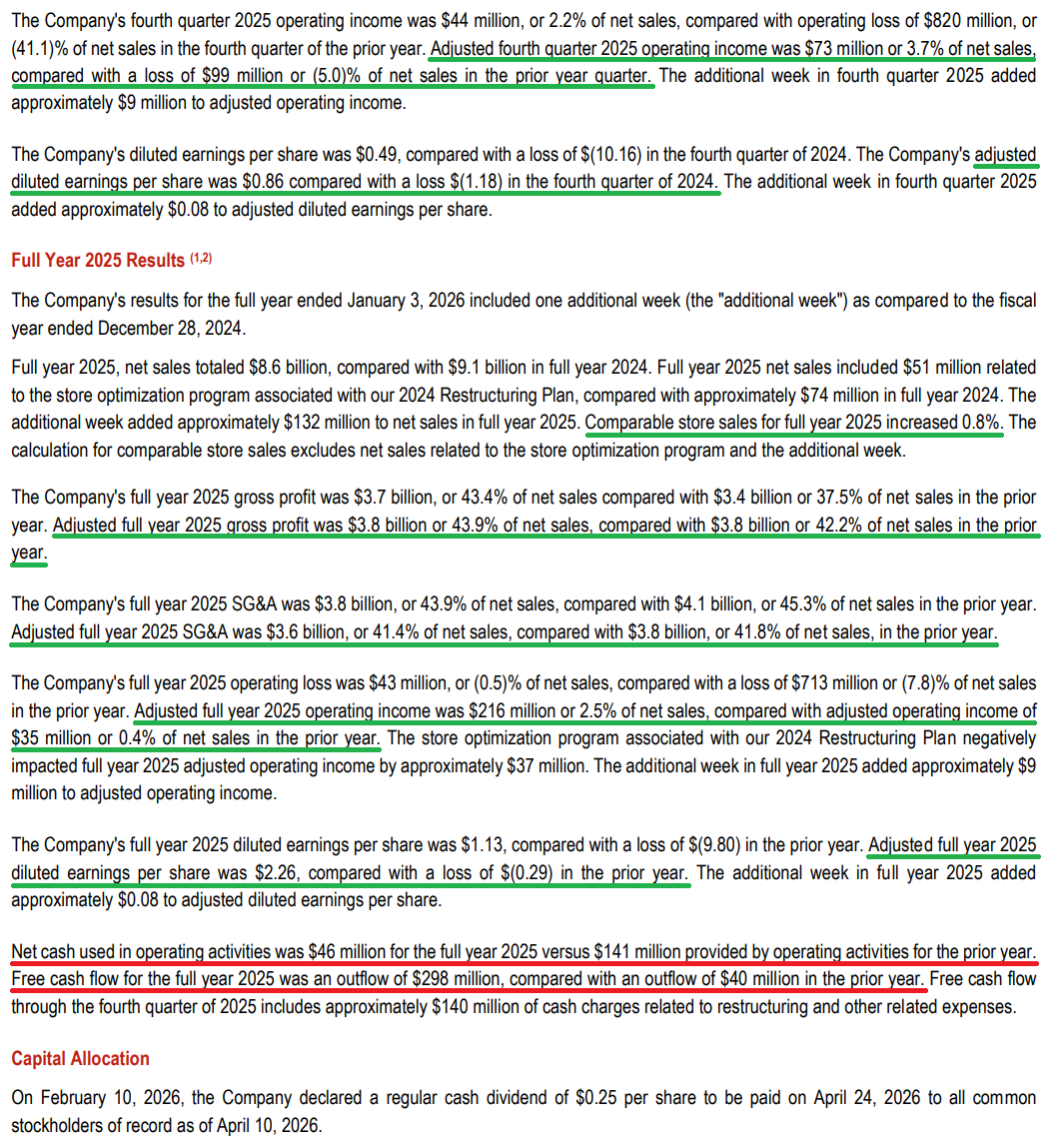 8) Management invested nearly $90M in long overdue store infrastructure upgrades in 2025, refreshing paint, HVAC systems, parking lots, signage, and racking across more than 1,600 locations. Another 1,000+ stores are slated for improvements in 2026, with the goal of creating a better environment for both team members and customers.