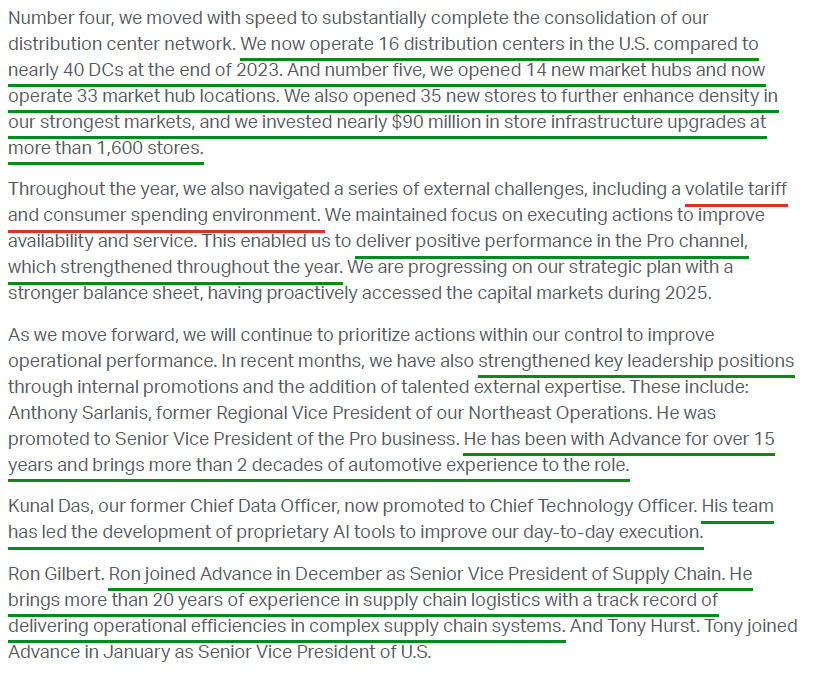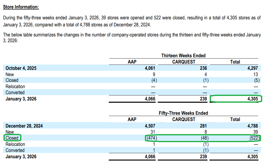 At the same time, AAP completed its store footprint rationalization, closing more than 700 underperforming and unprofitable stores to focus on the strongest markets. Auto parts retail is a game won through concentration and density, and Advance now holds a #1 or #2 share position in more than 75% of the markets it serves. The remaining 4,305 stores are receiving long-overdue facelifts, from parking lots to signage to racking, so they actually look open for business.