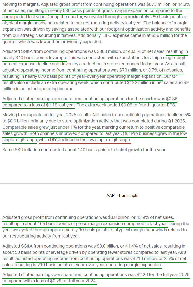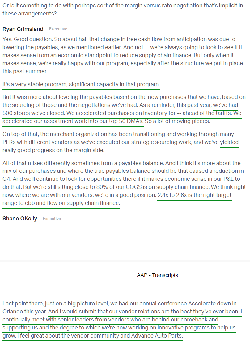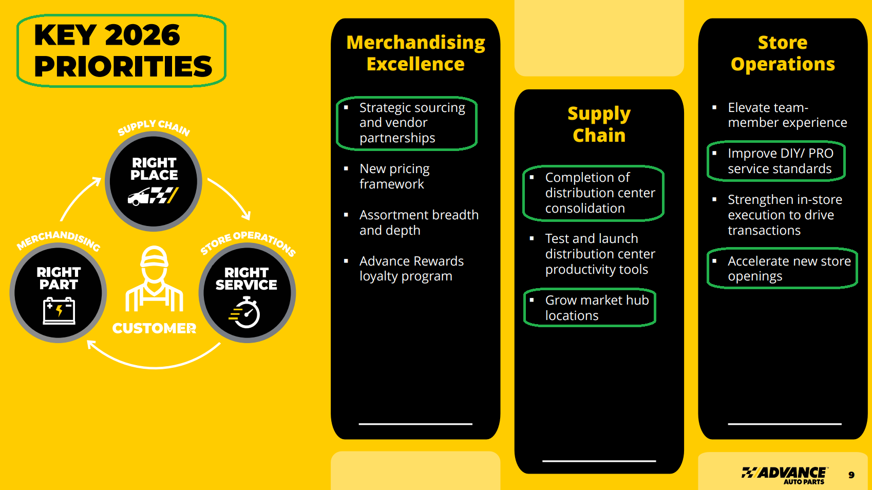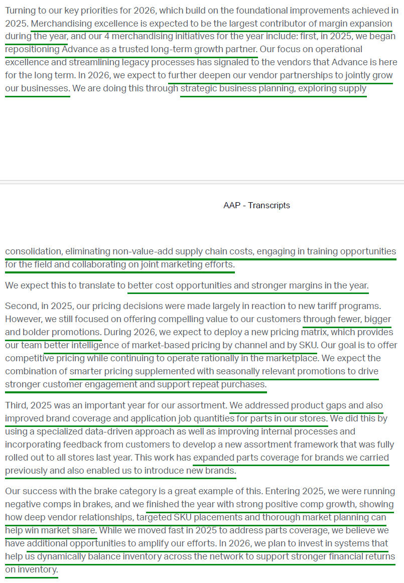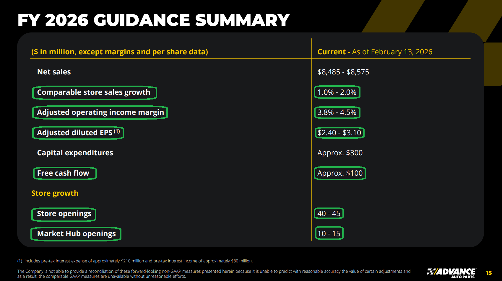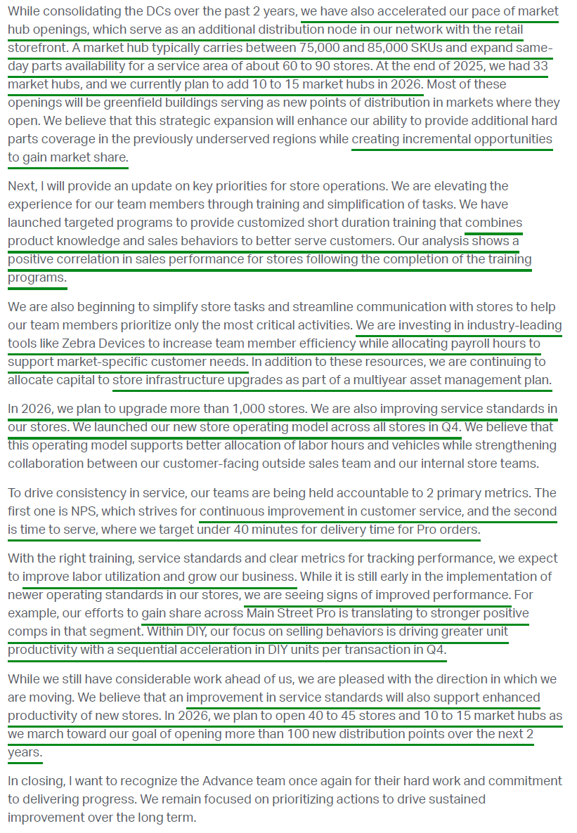 6) The supply chain consolidation initiative continues to make steady progress, with distribution centers reduced to 16 from 38 at the end of 2023. Management expects to complete the move to 15 DCs by the end of 2026, after which the focus will shift to simplifying and standardizing operations to help drive gross margin expansion. AAP also opened 14 new market hubs in 2025 (75K to 80K SKUs, same day delivery to 60 to 90 stores, ~100 bps comp lift), bringing the total to 33, with another 10 to 15 planned for 2026. This keeps AAP on pace to reach its 60 hub target by 2027 and unlock further market share gains.