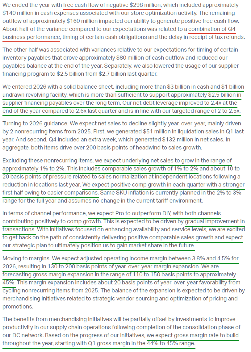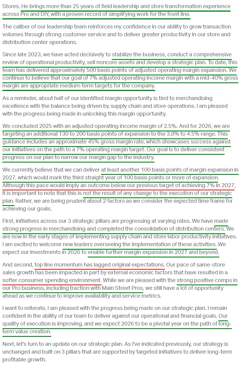10) Management is guiding to 2026 net sales of $8.49B to $8.58B, with comp sales growth accelerating to 1.0% to 2.0%. The Pro channel is expected to outperform DIY once again, though both channels are projected to post positive growth Y/Y and in each quarter. Adjusted operating margin is expected to reach 3.8% to 4.5%, with at least another 100 bps of expansion anticipated in 2027, marking a third consecutive year of 100+ bps improvement. That implies operating margins of ~5.15% in 2027, below the original 7% target, though management continues to view 7% as the appropriate medium term goal and attributes the timing difference to pacing rather than any change in strategic execution. Adjusted diluted EPS is expected to come in at $2.40 to $3.10 ($2.75 midpoint), ahead of the $2.67 consensus estimate.