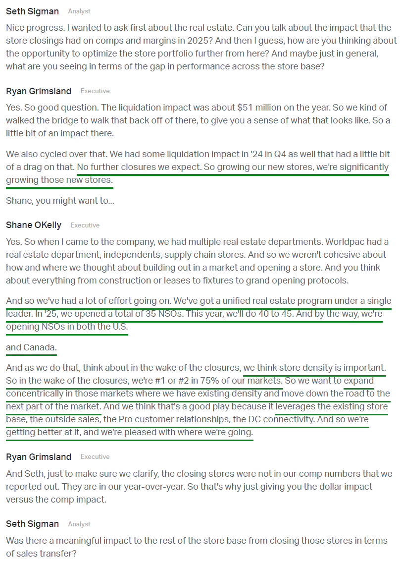 2) Comp sales growth in Q4 was 1.1%, with a slower start to the quarter followed by positive sales performance over the final eight weeks. For FY25, comps accelerated to 0.8%, marking the first full year of positive comp growth after three consecutive years of declines. The Pro channel delivered low single digit growth for the year, while DIY declined low single digits, though both channels improved Y/Y. Importantly, excluding weather related comparisons, the business has averaged low single digit positive comps over the past six months, with acceleration in units per transaction on both a one and two year basis.