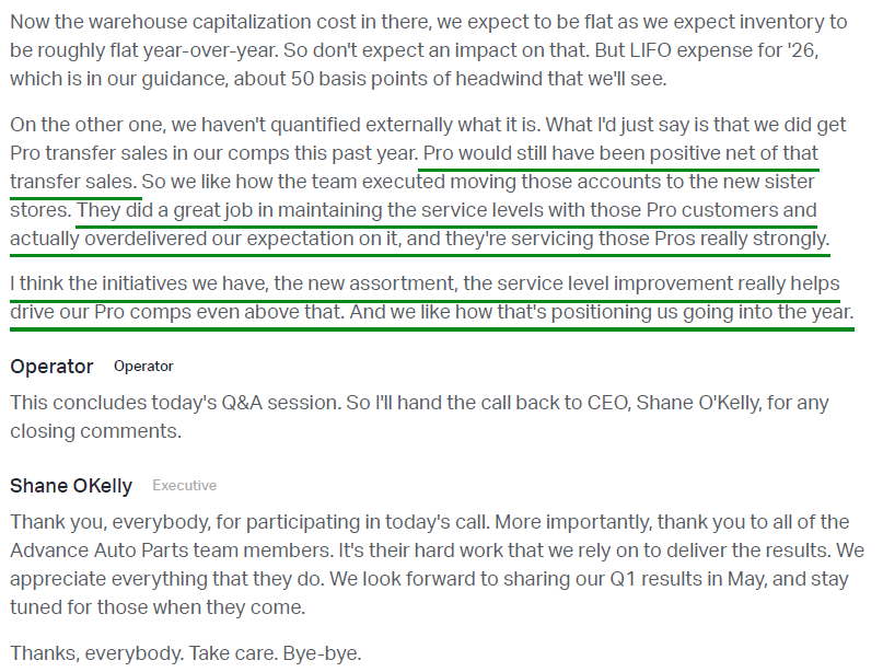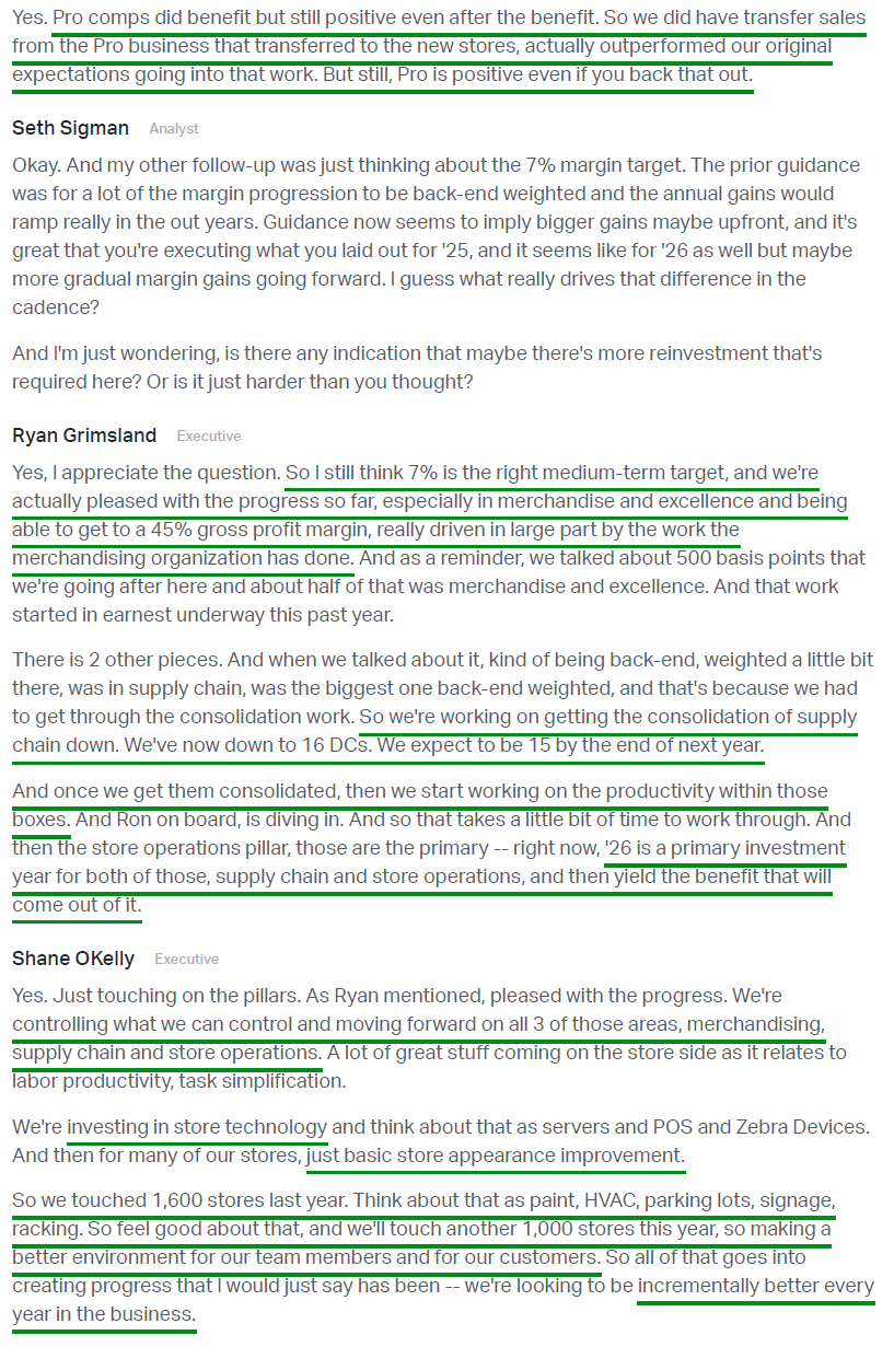 3) The Pro channel strengthened as the year progressed and delivered nearly 4% comp sales growth in the quarter. While the channel benefited from store transfer sales tied to closed locations that exceeded initial expectations, it still generated positive growth even excluding those transfers. Performance was supported by improved store availability, which increased from the low 90% range at the start of the year to the high 90% range, along with faster delivery times, reducing average delivery by more than 10 minutes from over 50 minutes at the start of 2025.