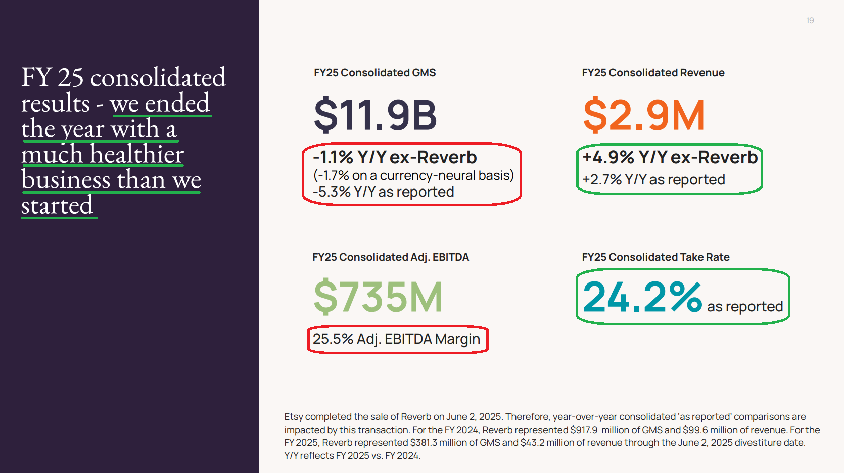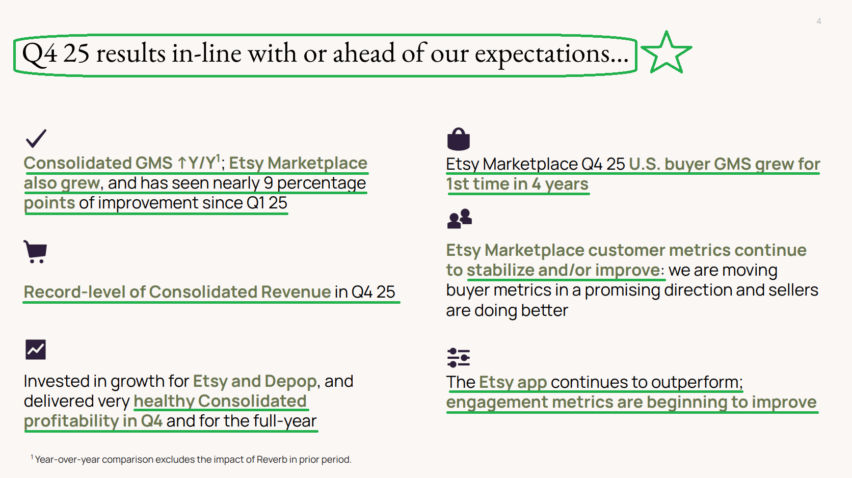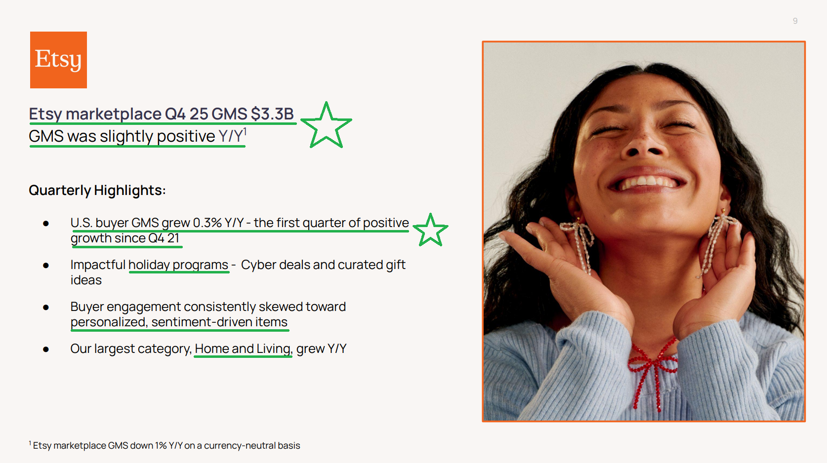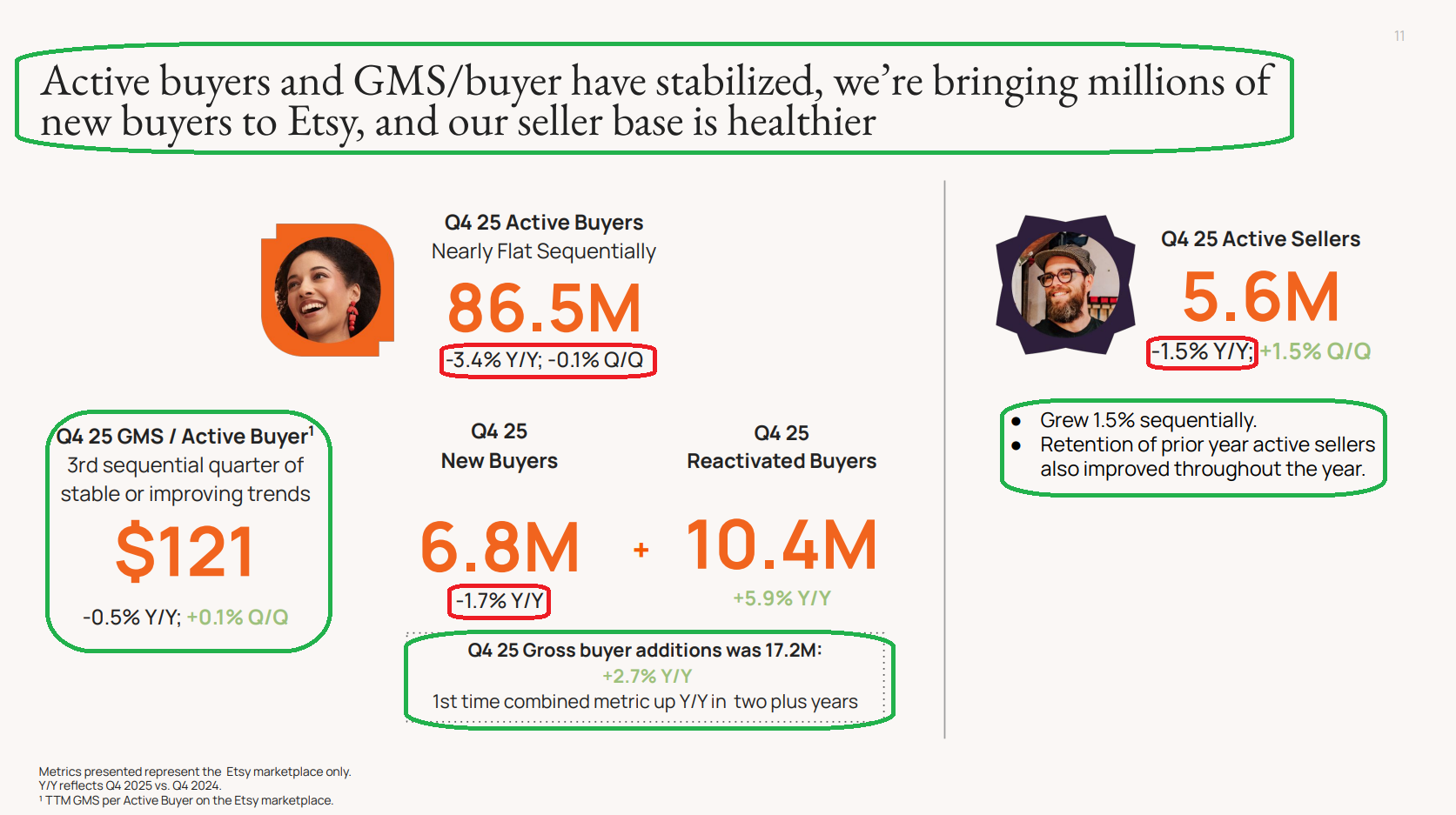 2) Consolidated GMS increased +2.4% to $3.59B (in line with consensus and prior guidance of $3.5B to $3.65B), driven by core Etsy GMS rising +0.1% to $3.29B (first positive comp since Q3 2023 and nearly 900 bps of improvement since Q1 2025). U.S. buyer GMS on the Etsy marketplace also grew for the first time in four years (+0.3%). For FY25, total GMS reached $11.92B (-1.1% Y/Y ex Reverb), with core Etsy GMS of $10.46B (-3.9% Y/Y vs -6% in FY24). Key customer metrics continued to stabilize, including TTM GMS per active buyer of $121 (-0.5% Y/Y, third straight quarter of stable or improving trends), 17.2M gross buyer additions (first growth in 2+ years), and 5.6M active sellers (-1.5% Y/Y, with sequential growth and improved retention).