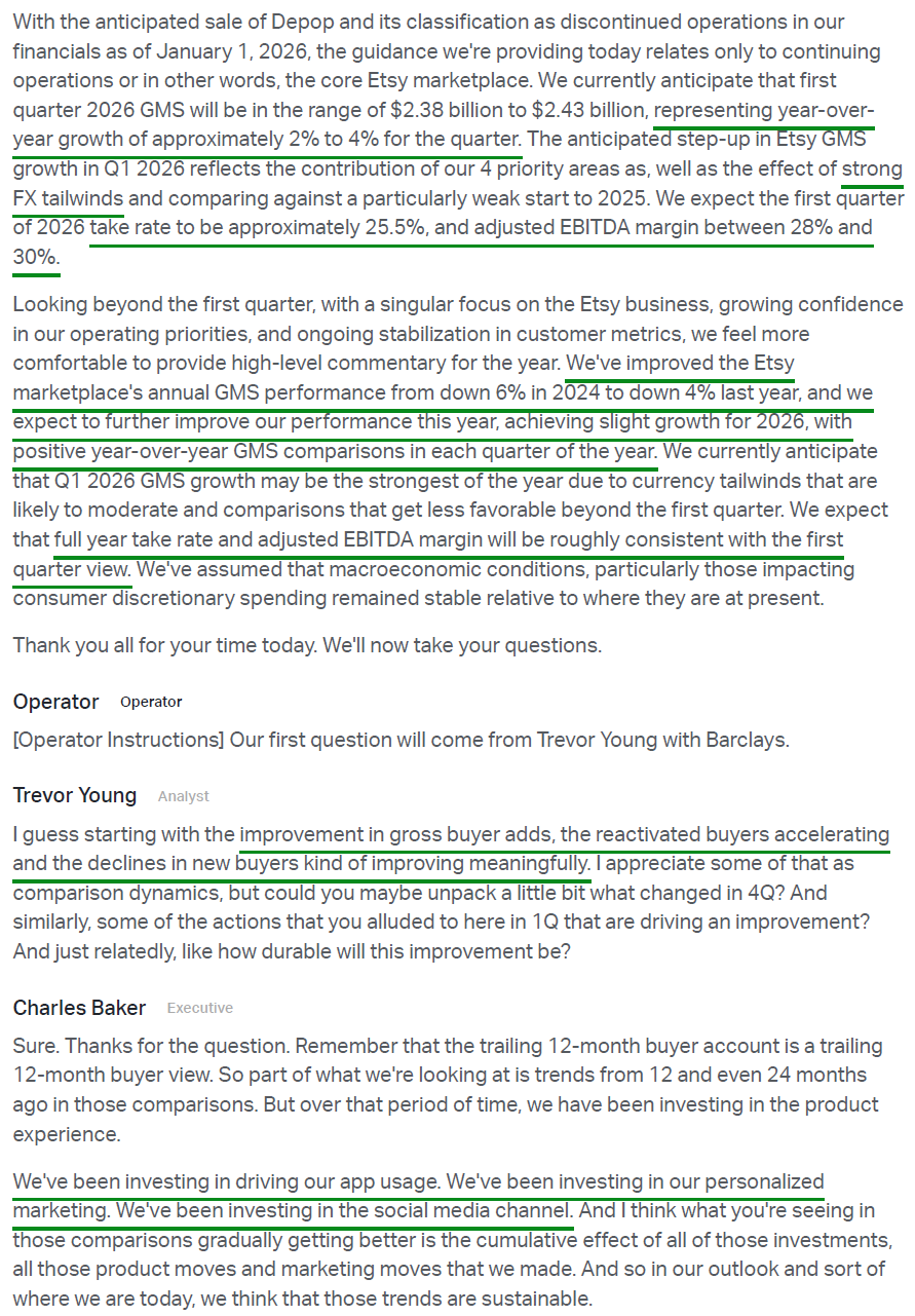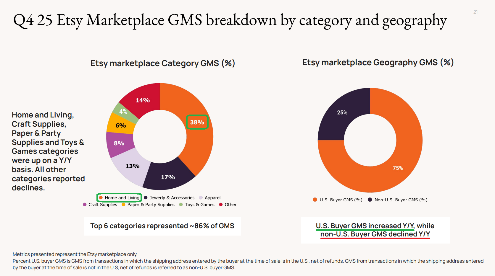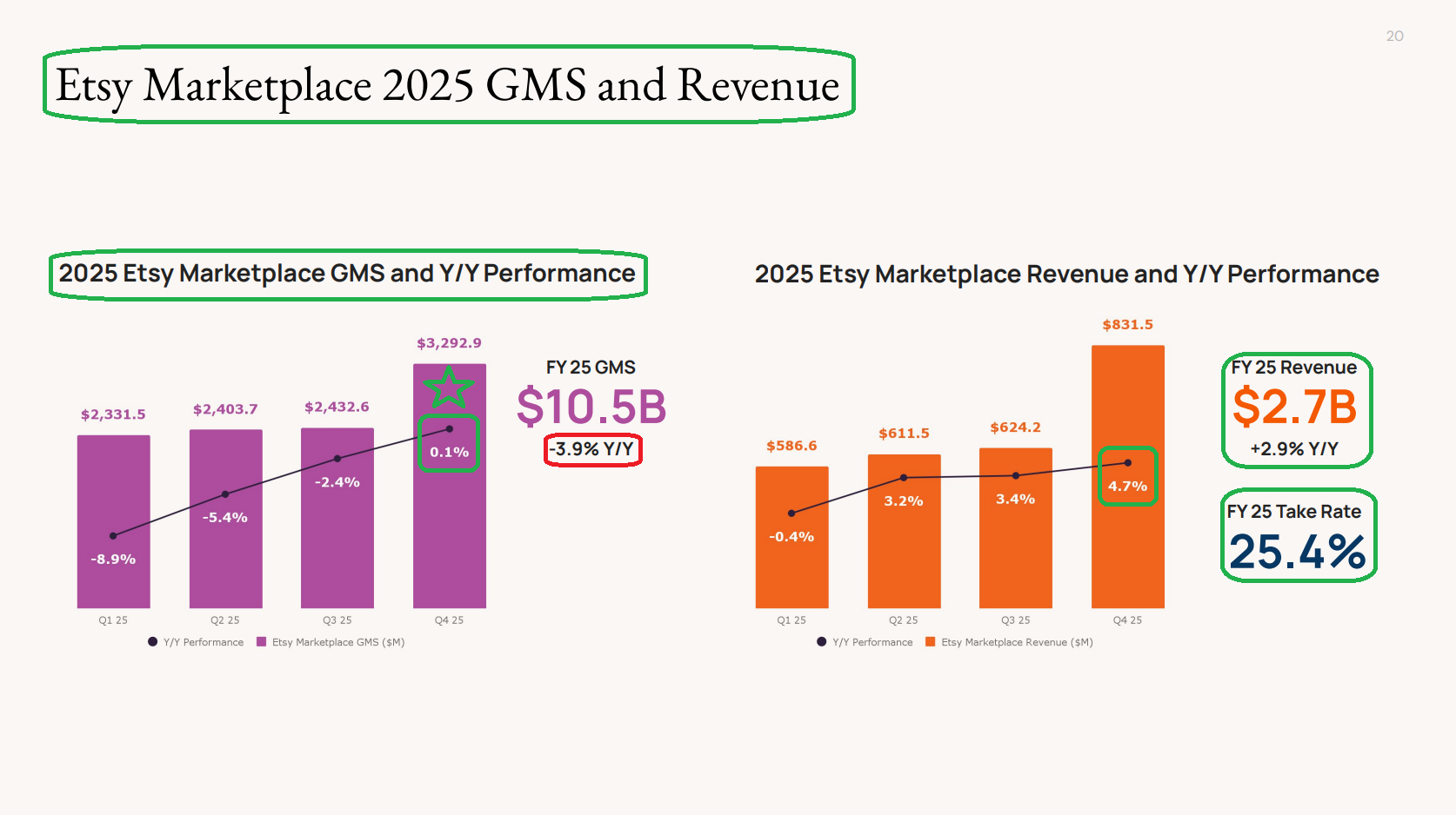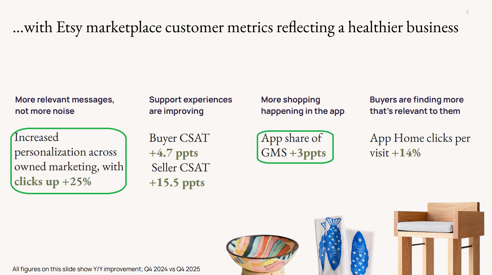 2) Consolidated GMS increased +2.4% to $3.59B (in line with consensus and prior guidance of $3.5B to $3.65B), driven by core Etsy GMS rising +0.1% to $3.29B (first positive comp since Q3 2023 and nearly 900 bps of improvement since Q1 2025). U.S. buyer GMS on the Etsy marketplace also grew for the first time in four years (+0.3%). For FY25, total GMS reached $11.92B (-1.1% Y/Y ex Reverb), with core Etsy GMS of $10.46B (-3.9% Y/Y vs -6% in FY24). Key customer metrics continued to stabilize, including TTM GMS per active buyer of $121 (-0.5% Y/Y, third straight quarter of stable or improving trends), 17.2M gross buyer additions (first growth in 2+ years), and 5.6M active sellers (-1.5% Y/Y, with sequential growth and improved retention).