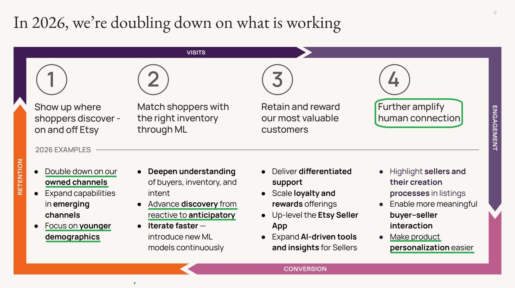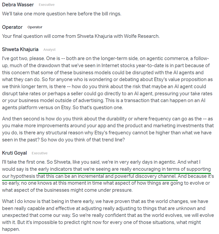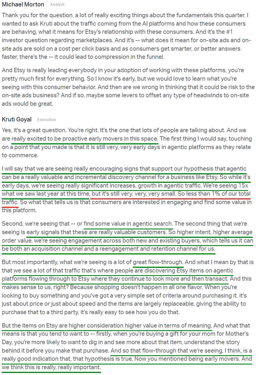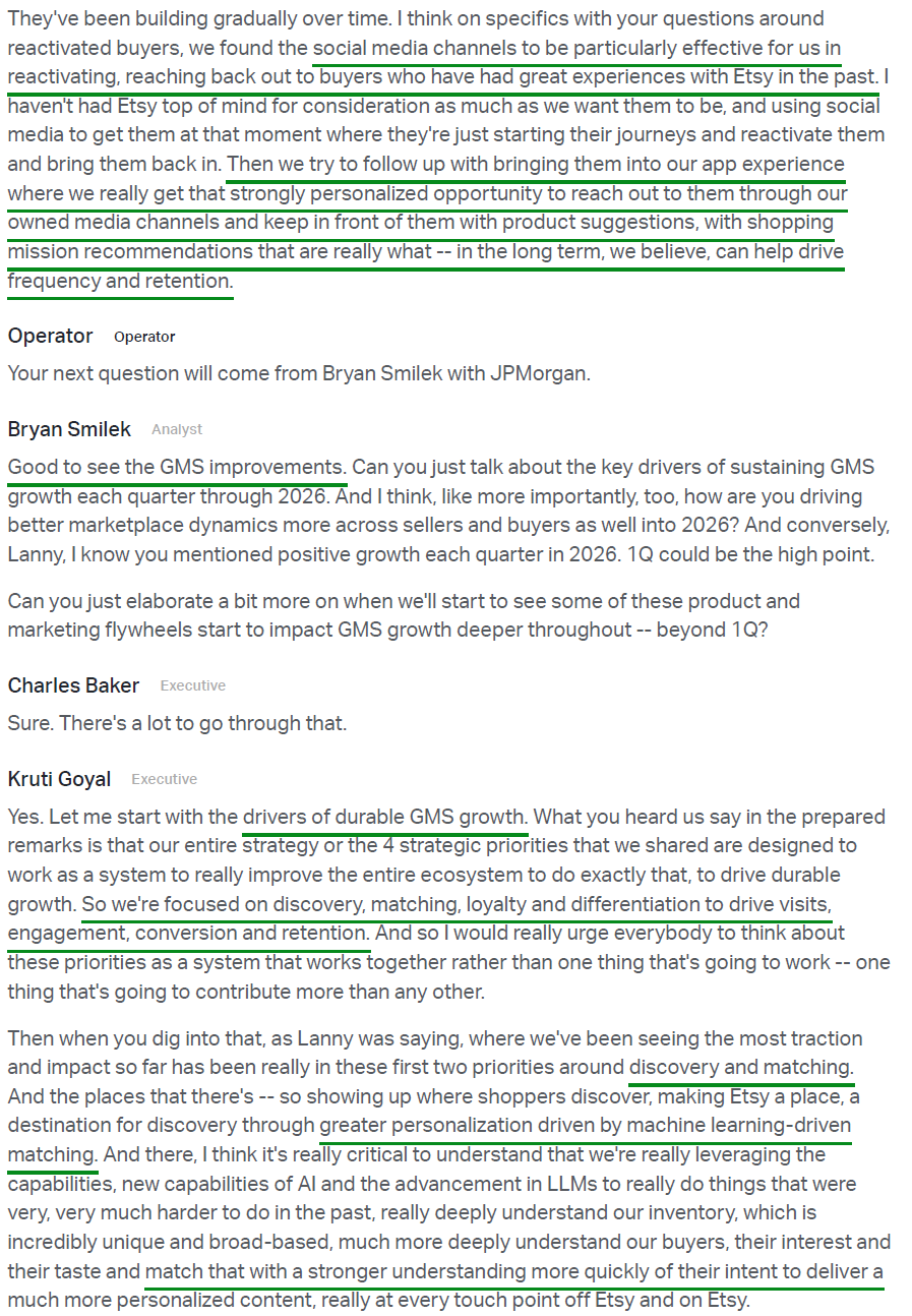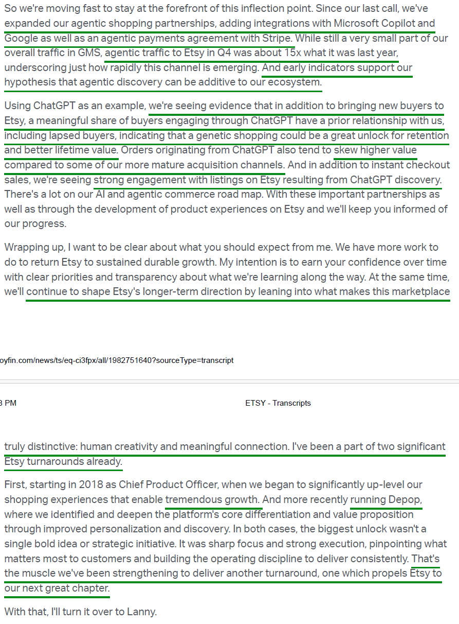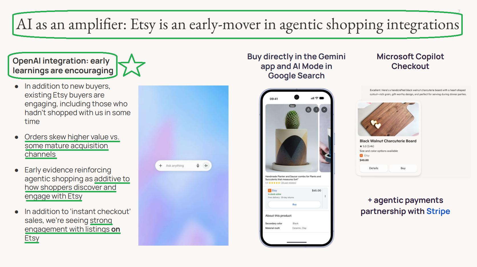 6) In addition to the previously announced integration with OpenAI’s ChatGPT Instant Checkout, Etsy has launched agentic shopping partnerships with Google and Microsoft, enabling signed in U.S. users to purchase select Etsy items directly within AI powered experiences, including Gemini and Copilot. Agentic remains a very small portion of total traffic and GMS (<1%), but traffic grew 15x Y/Y in Q4. Early signals are encouraging, with higher average order values, strong engagement with Etsy listings, and a meaningful share of purchases coming from lapsed buyers via ChatGPT, suggesting agentic could become a powerful lever for retention and reactivating Etsy’s pool of 100M+ lapsed buyers.