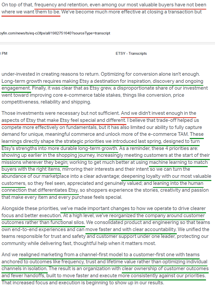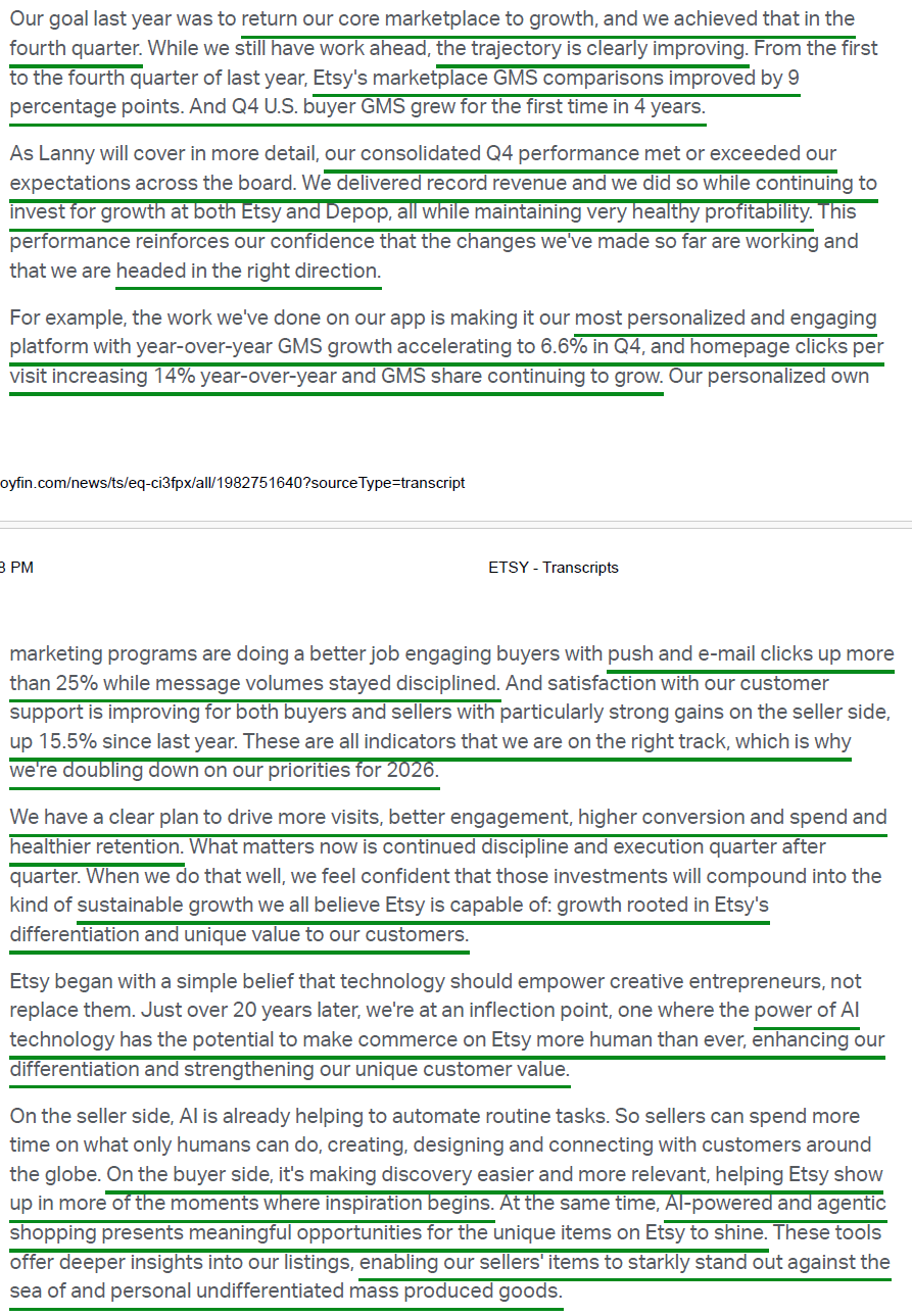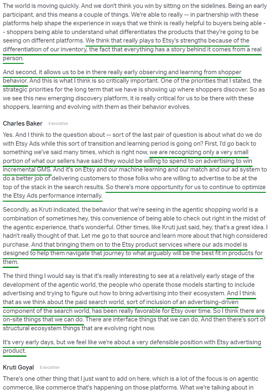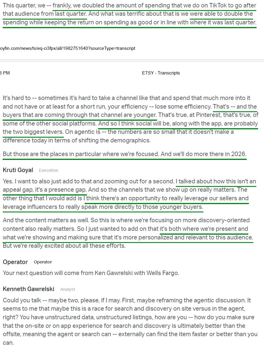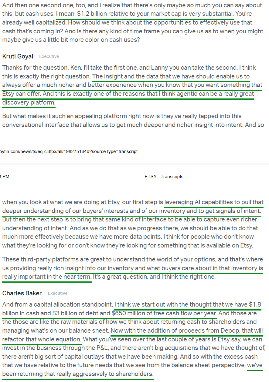 6) In addition to the previously announced integration with OpenAI’s ChatGPT Instant Checkout, Etsy has launched agentic shopping partnerships with Google and Microsoft, enabling signed in U.S. users to purchase select Etsy items directly within AI powered experiences, including Gemini and Copilot. Agentic remains a very small portion of total traffic and GMS (<1%), but traffic grew 15x Y/Y in Q4. Early signals are encouraging, with higher average order values, strong engagement with Etsy listings, and a meaningful share of purchases coming from lapsed buyers via ChatGPT, suggesting agentic could become a powerful lever for retention and reactivating Etsy’s pool of 100M+ lapsed buyers.