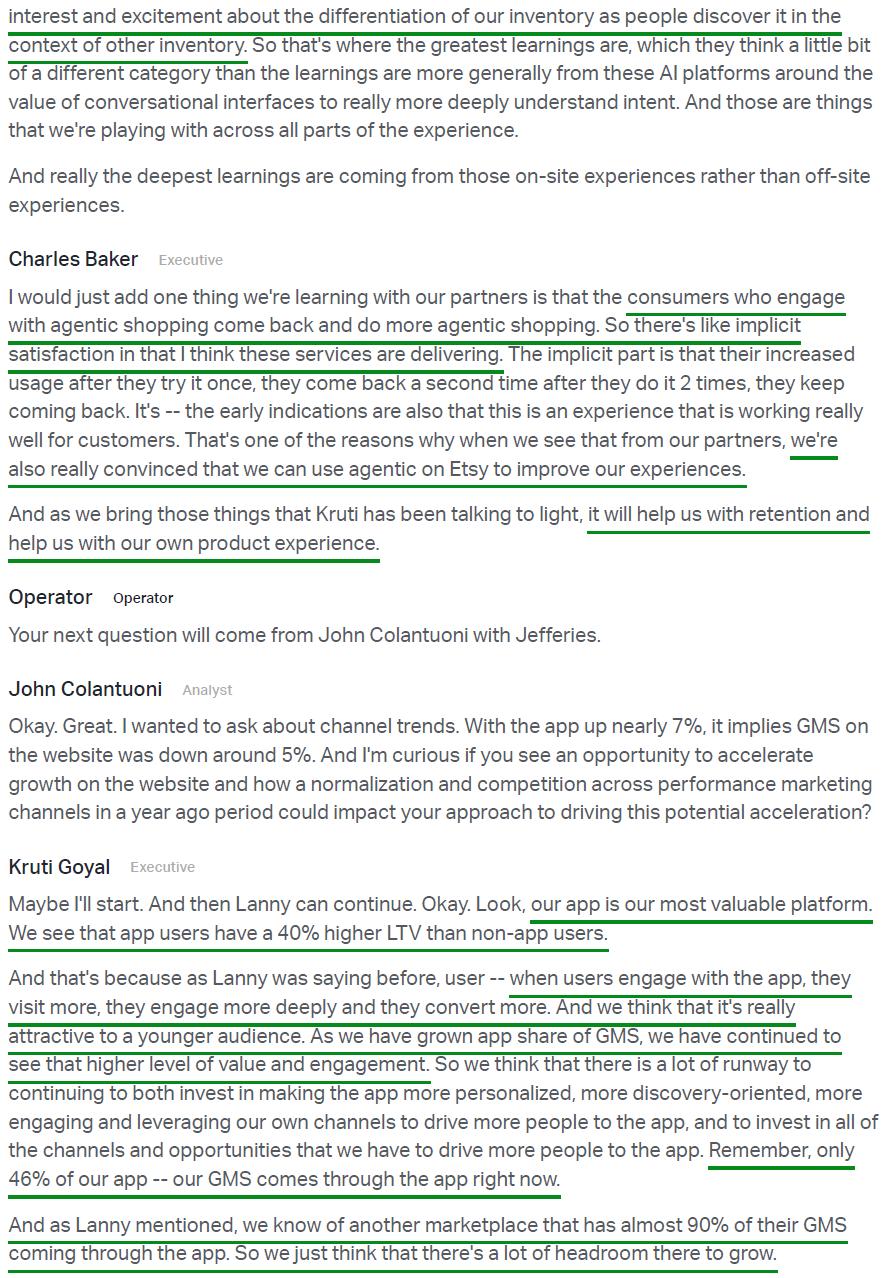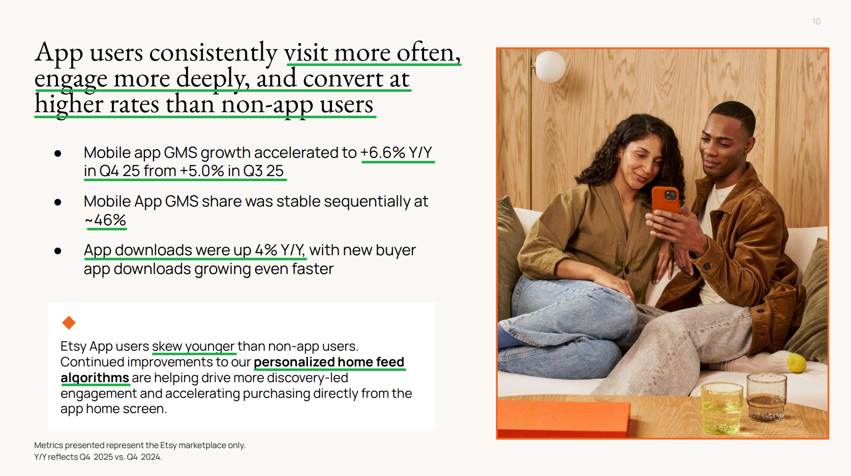 4) The Etsy mobile app continues to outperform, with app GMS accelerating to +6.6% (vs +5% in Q3). Downloads increased +4% Y/Y, and app GMS now represents ~46% of total GMS (stable sequentially and up ~500 bps over the past two years). App users generate ~40% higher lifetime value than non app users, driven by more frequent visits, deeper engagement, and higher conversion rates. App users also tend to skew much younger, making the app a key channel for engaging this important demographic.