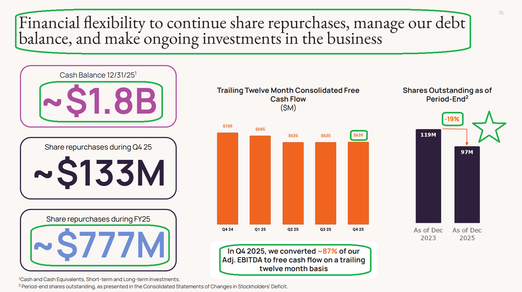 7) Etsy generated $308M of free cash flow in Q4, bringing FY25 FCF to $639M (~12% yield) with adjusted EBITDA to FCF conversion of 87%. Management returned well over 100% of FCF to shareholders, repurchasing $777M of stock during the year and reducing the share count by 14.4M shares, a 19% reduction over the past two years. Remaining repurchase authorization stands at $973.2M, enough to buy in nearly 20% of the company, supported by $1.4B of cash on the balance sheet before factoring in the ~$1.2B of expected Depop proceeds.