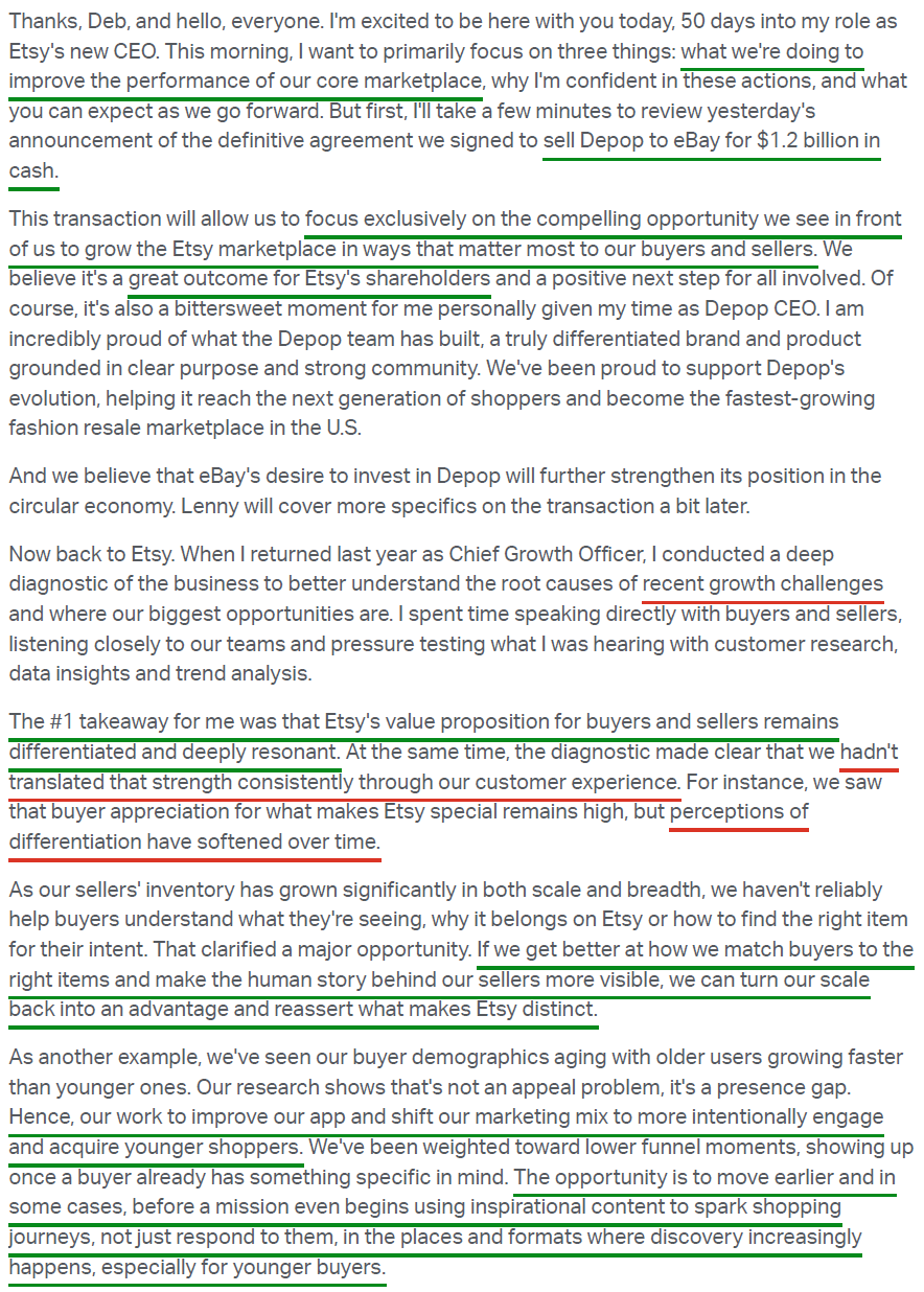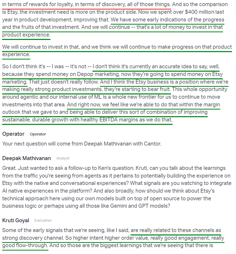 8) Adjusted EBITDA margins came in at 25.2% (-420 bps Y/Y), ahead of prior guidance of ~24%, bringing FY25 margins to 25.5% (-230 bps Y/Y). The contraction was largely driven by stepped up investment at Depop, which will now roll off following the sale. Ex Depop, the core Etsy marketplace delivered its highest adjusted EBITDA margin of 2025 at nearly 30%.