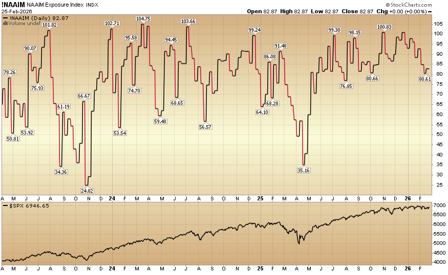 The NAAIM (National Association of Active Investment Managers Index) (Video Explanation) rose to 82.87% equity exposure this week from last week’s 80.61%.