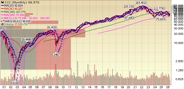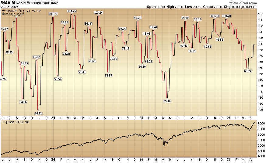 The NAAIM (National Association of Active Investment Managers Index) (Video Explanation) rose to 79.49% equity exposure this week from last week’s 69.38%.