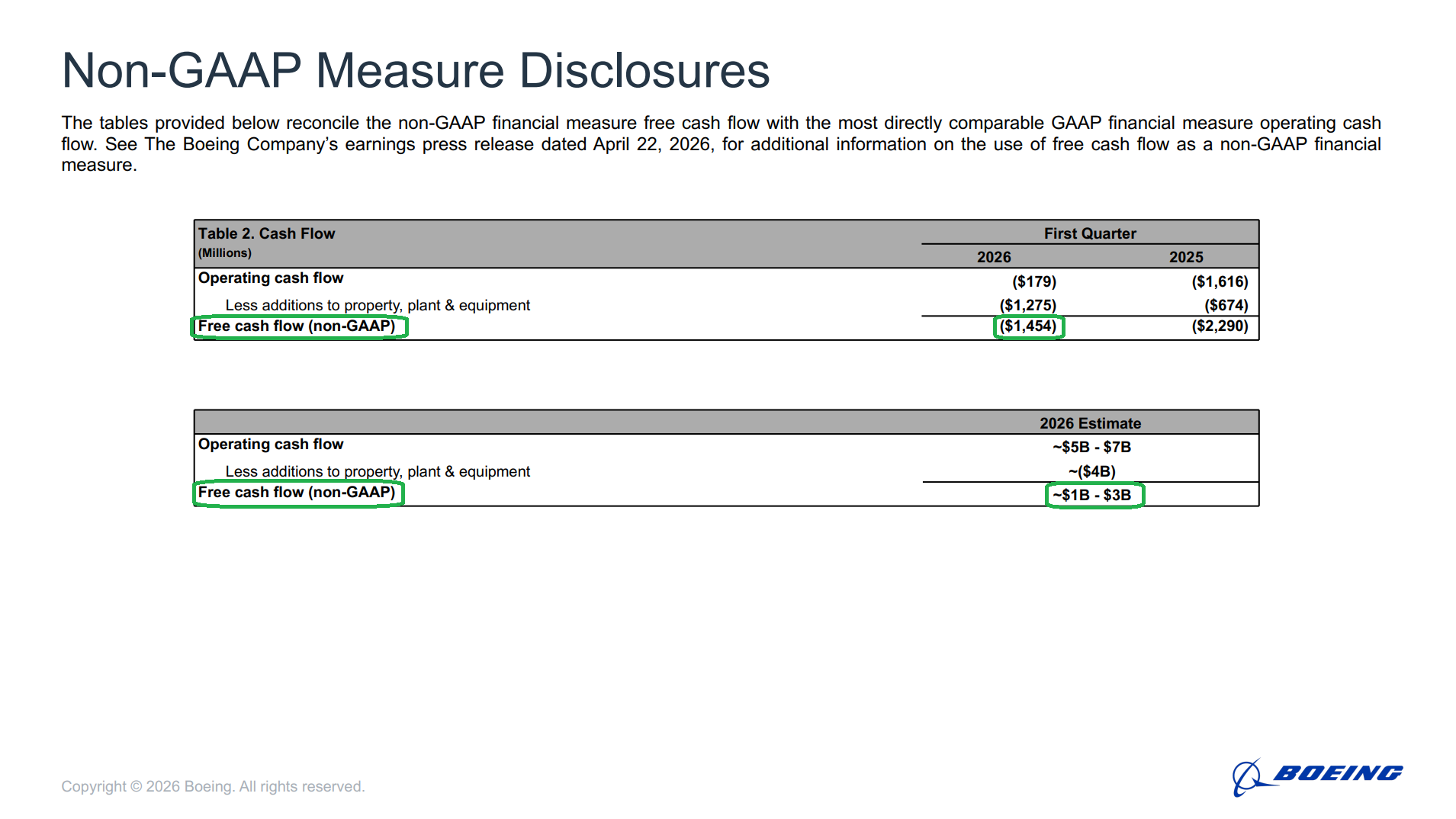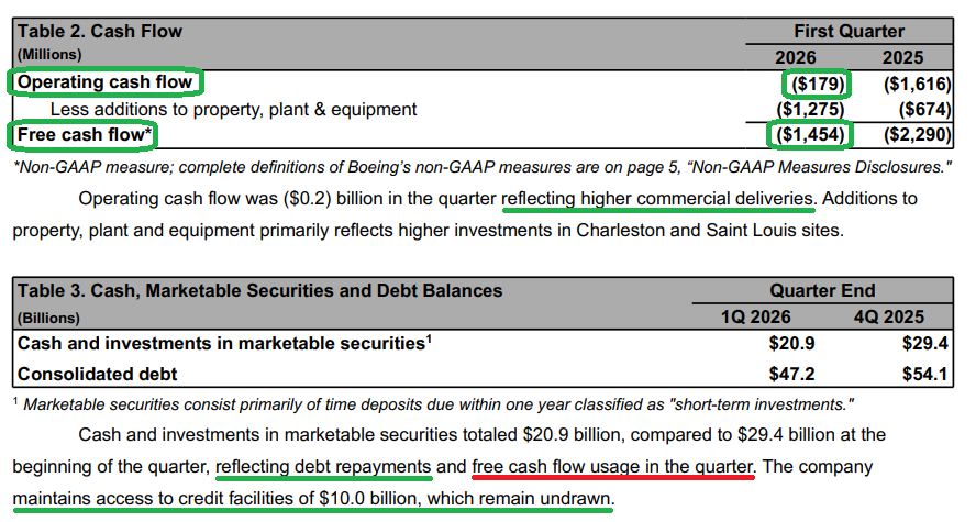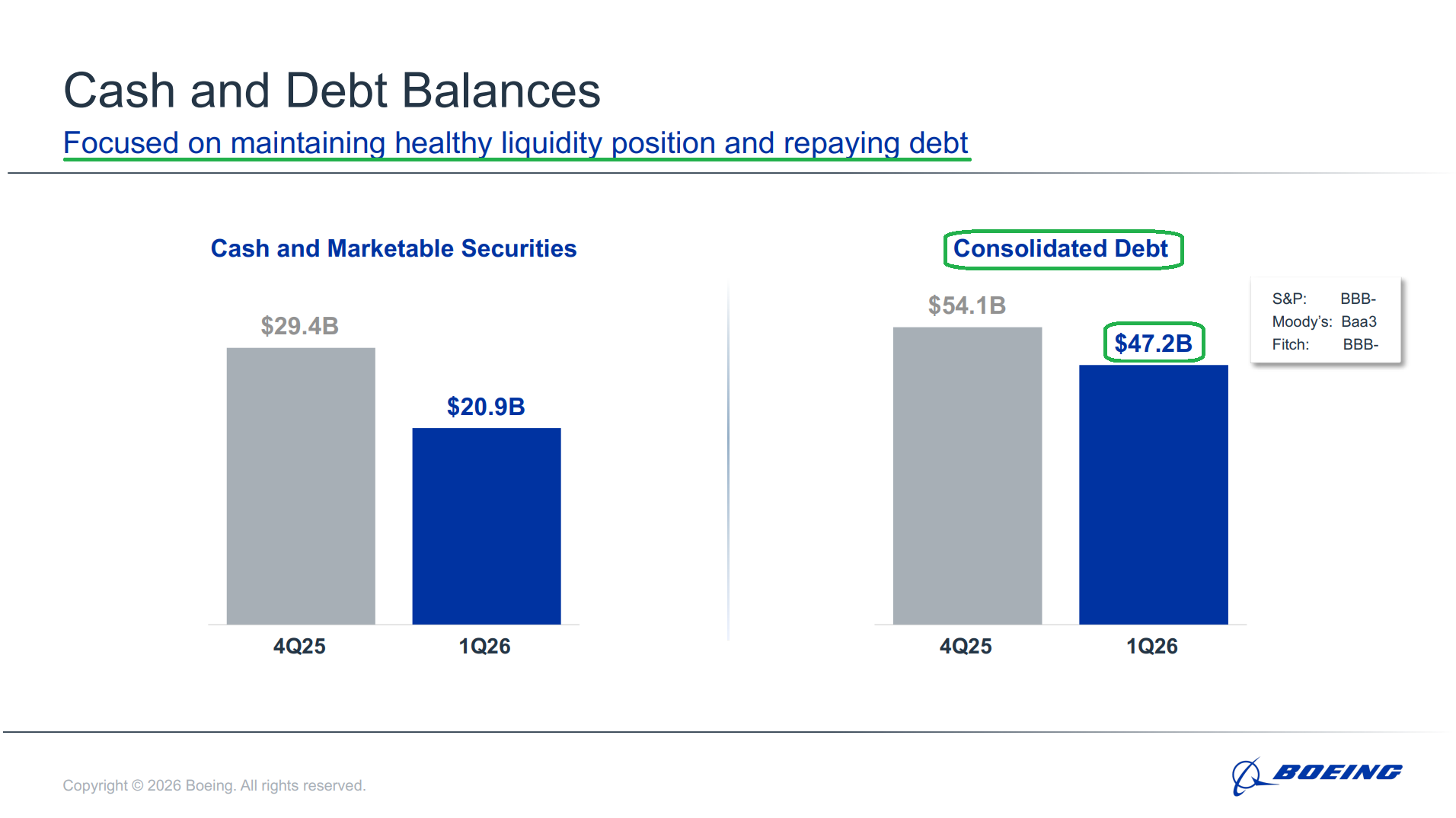 8) Cash and marketable securities ended the quarter at $20.9B, down from $29.4B at year-end, primarily reflecting debt repayments and the quarter’s FCF usage. Consolidated debt declined to $47.2B from $54.1B, with $1.4B of maturities remaining for the year and $10B of undrawn credit facilities available. Management remains firmly committed to strengthening the balance sheet and maintaining Boeing’s investment-grade credit rating as a top priority.