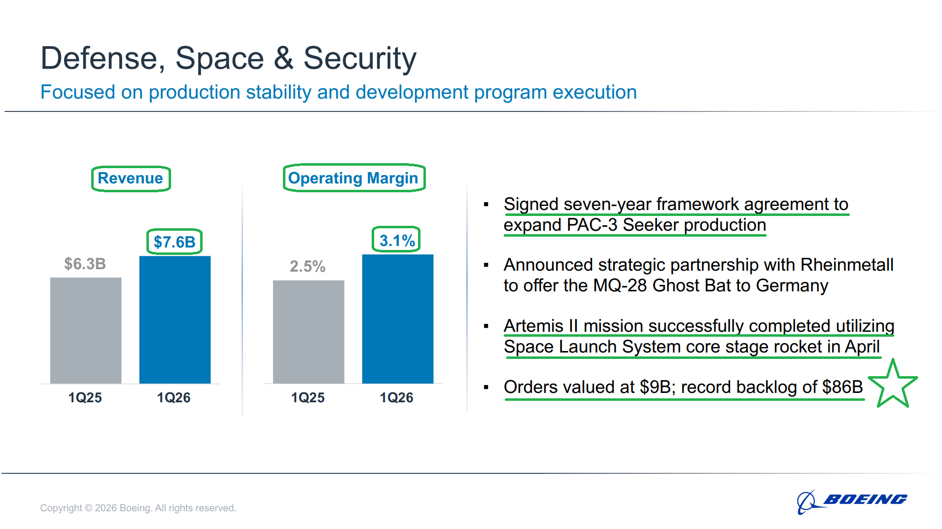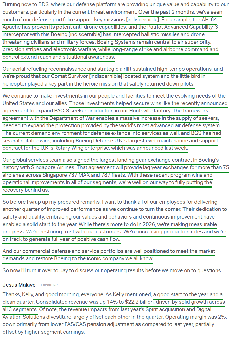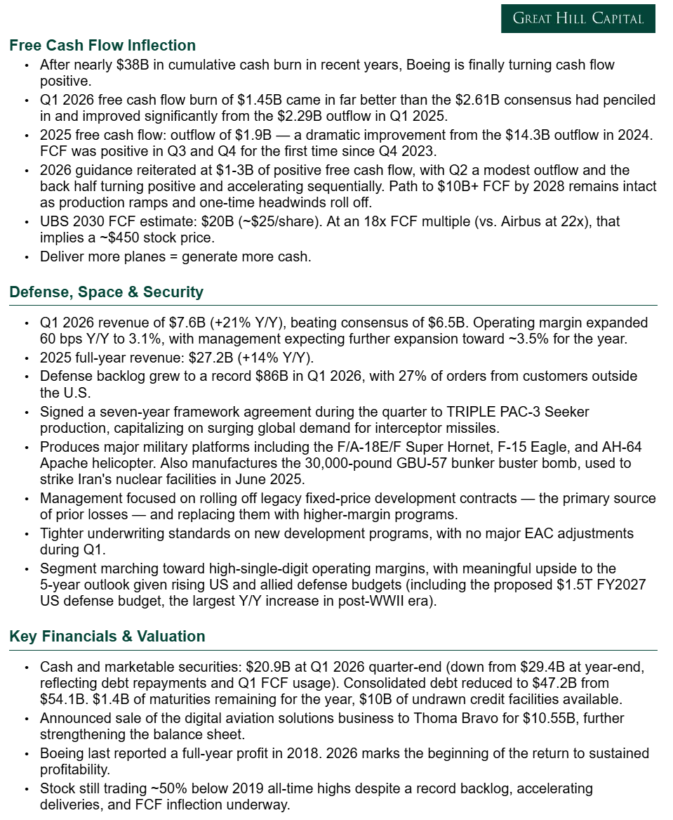 5) The Defense, Space & Security segment posted revenue of $7.6B (+21% Y/Y), handily beating consensus estimates of $6.5B. Operating margin expanded 60 bps Y/Y to 3.1%, driven by higher volume on KC-46 Tanker, missiles and weapons, and classified programs, with management expecting further expansion toward ~3.5% throughout the year. Boeing booked $9B of orders during the quarter, growing the backlog to a record ~$86B with 27% coming from international customers, and signed a seven-year framework agreement to TRIPLE PAC-3 Seeker production amid surging demand. Management reiterated its confidence in the segment’s march toward high-single-digit operating margins and expects meaningful upside to its five-year defense outlook given the current environment and rising US and allied defense budgets. Most importantly, the segment continues to reduce risk across development programs, with no major EAC adjustments during the quarter and new opportunities subject to tighter underwriting standards.