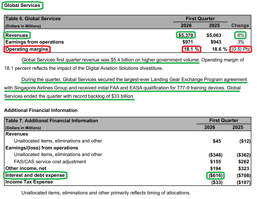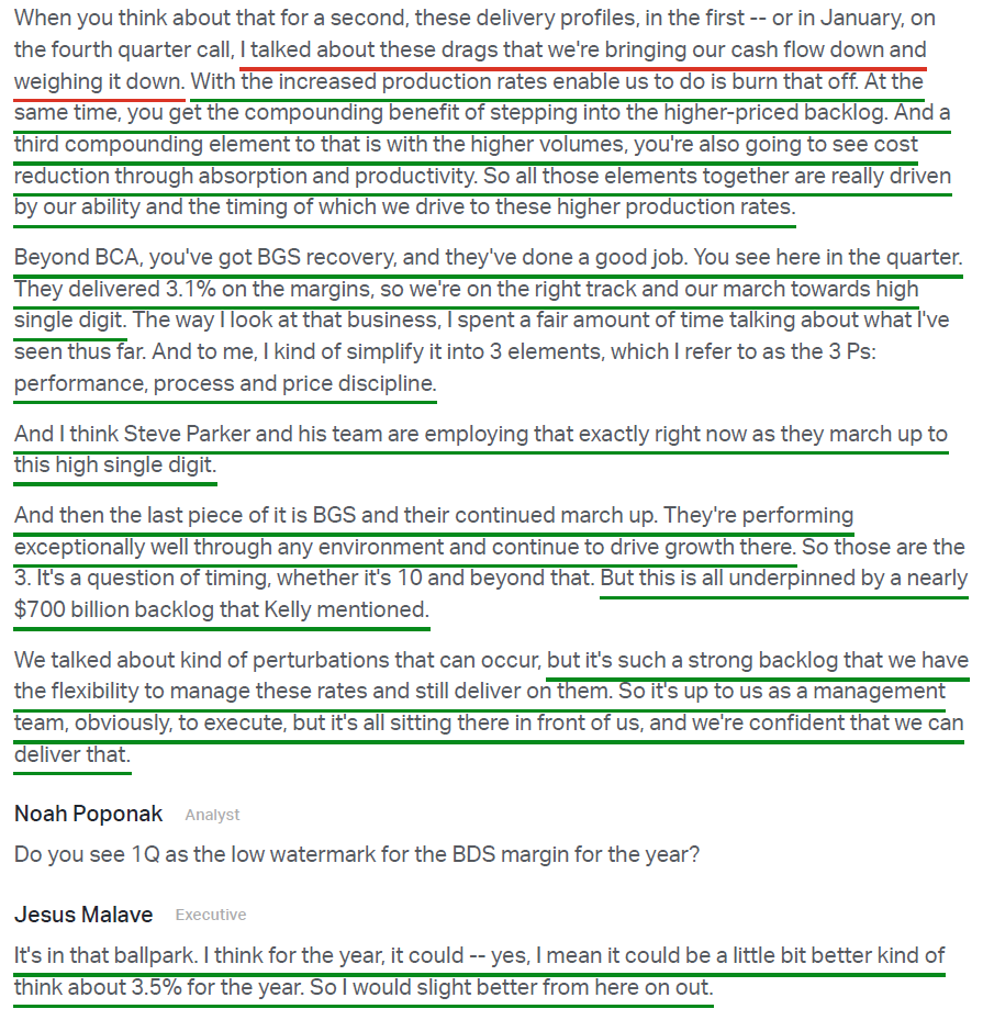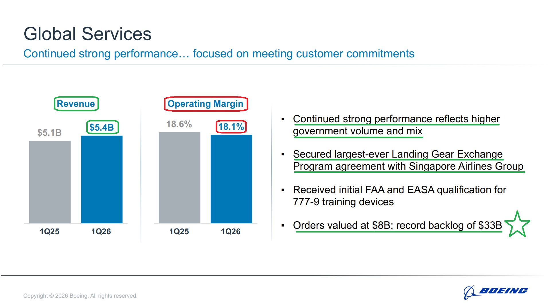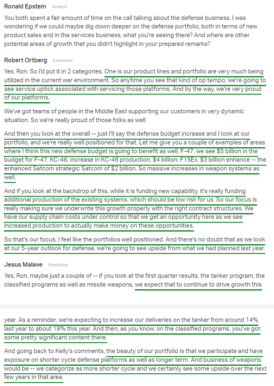 5) The Defense, Space & Security segment posted revenue of $7.6B (+21% Y/Y), handily beating consensus estimates of $6.5B. Operating margin expanded 60 bps Y/Y to 3.1%, driven by higher volume on KC-46 Tanker, missiles and weapons, and classified programs, with management expecting further expansion toward ~3.5% throughout the year. Boeing booked $9B of orders during the quarter, growing the backlog to a record ~$86B with 27% coming from international customers, and signed a seven-year framework agreement to TRIPLE PAC-3 Seeker production amid surging demand. Management reiterated its confidence in the segment’s march toward high-single-digit operating margins and expects meaningful upside to its five-year defense outlook given the current environment and rising US and allied defense budgets. Most importantly, the segment continues to reduce risk across development programs, with no major EAC adjustments during the quarter and new opportunities subject to tighter underwriting standards.
