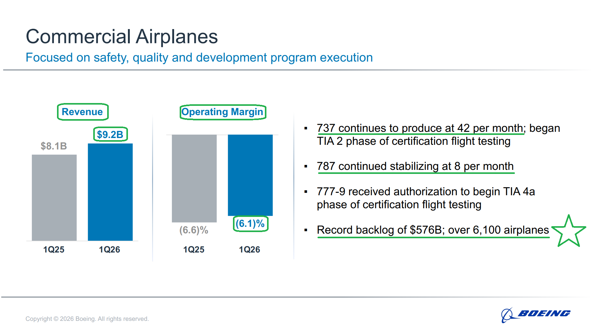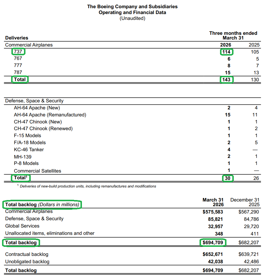 2) The Commercial Airplanes segment posted revenue of $9.2B (+13% Y/Y) during the quarter, driven by 143 deliveries, up 10% Y/Y and the highest first quarter delivery total since 2019. Notably, Boeing outshipped European rival Airbus by 29 jets during the quarter, the widest delivery gap since 2018. Segment operating margin improved modestly to (6.1%) from (6.6%) last year, with management expecting sequential improvement throughout the year and positive operating margins by mid-2027. Commercial backlog reached a record ~$576B, including over 6,100 airplanes, with 140 net orders booked during the quarter.