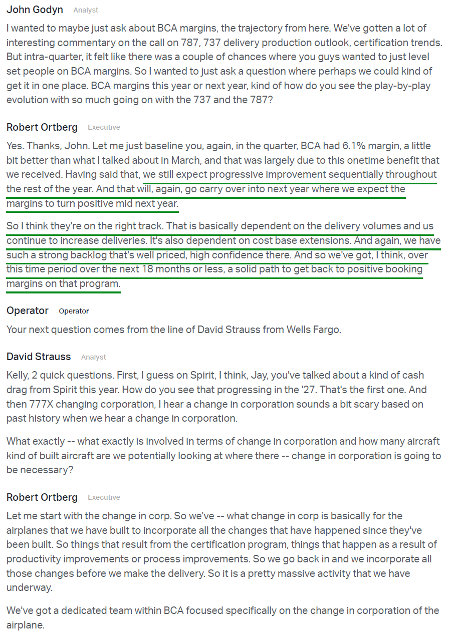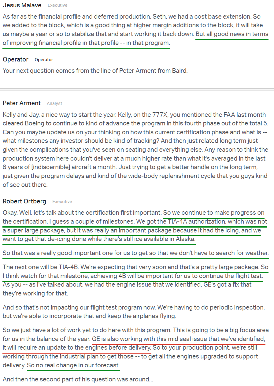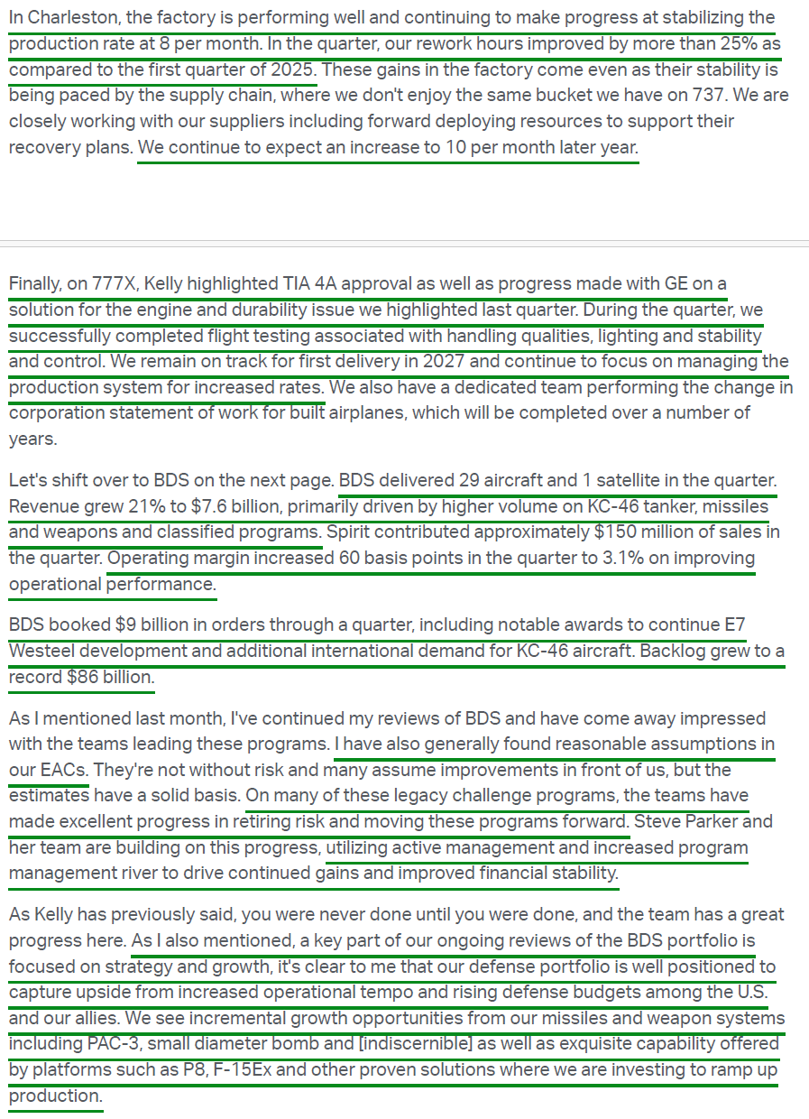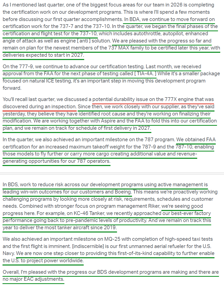 9) Management continues to expect certification of the long-delayed 737 MAX 7 and MAX 10 later this year, with deliveries starting in 2027 and the FAA noting no roadblocks to approval. The 737-10 made progress on the final phase of certification flight testing during the quarter, and the 787-9 and 787-10 received FAA certification for increased maximum takeoff weight. On the 777X, the program continues to make good progress, with first delivery still expected in 2027, and GE Aerospace believes it has identified the root cause of the previously flagged engine durability issue and is working on finalizing a modification.