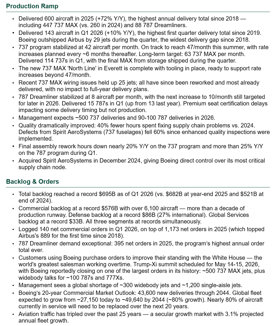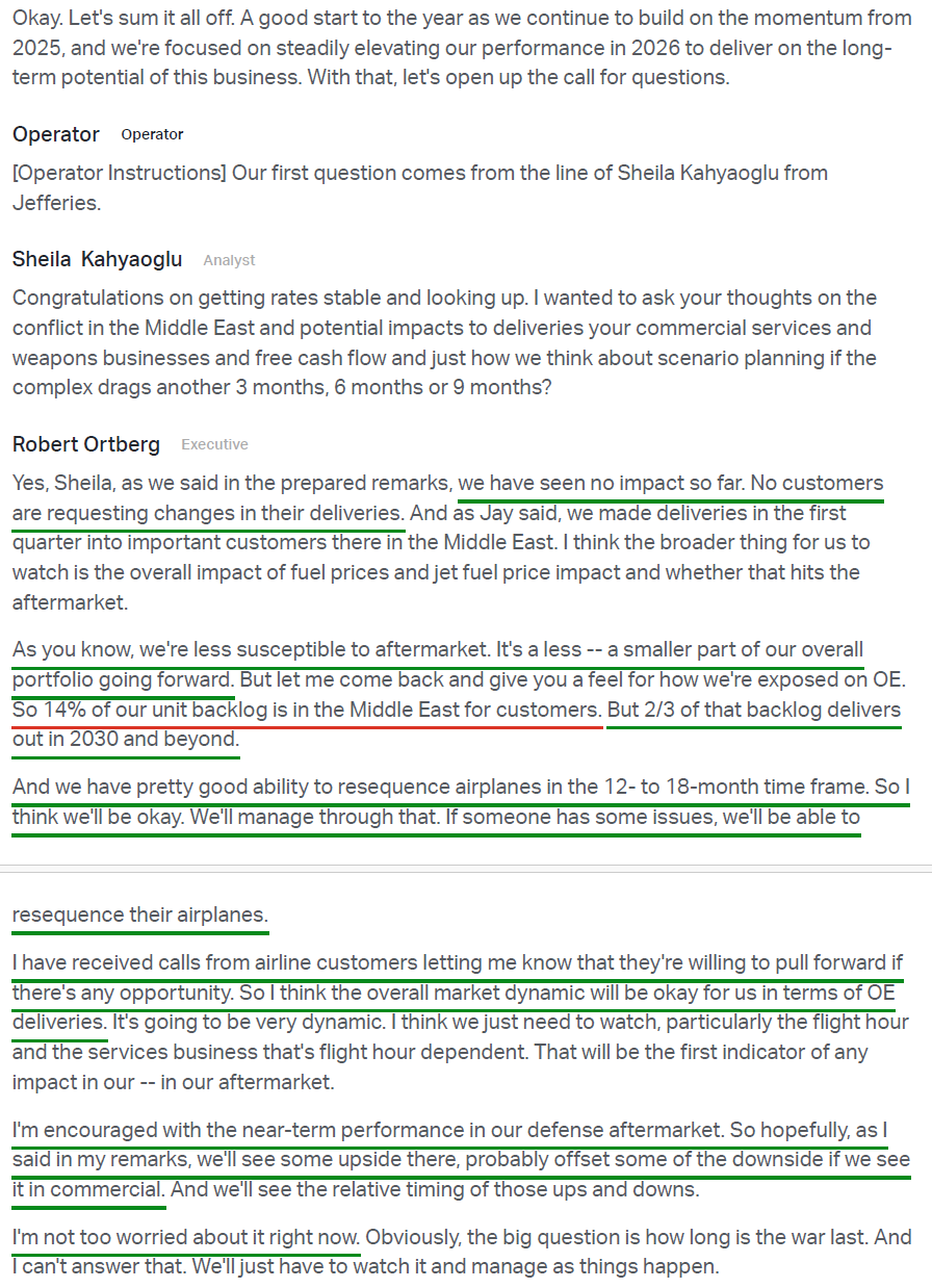 10) On the Iran War, management noted ZERO impact on airplane deliveries to date, with no customers requesting delivery deferrals and no material supply chain disruptions. Boeing has delivered four airplanes to customers in the region as planned since the conflict began. While ~14% of Boeing’s unit backlog is tied to Middle East customers, two-thirds of that backlog delivers in 2030 and beyond, giving Boeing plenty of flexibility to re-sequence airplanes within a 12-18 month timeframe if needed. Several other customers have also already offered to pull forward deliveries if opportunities arise.