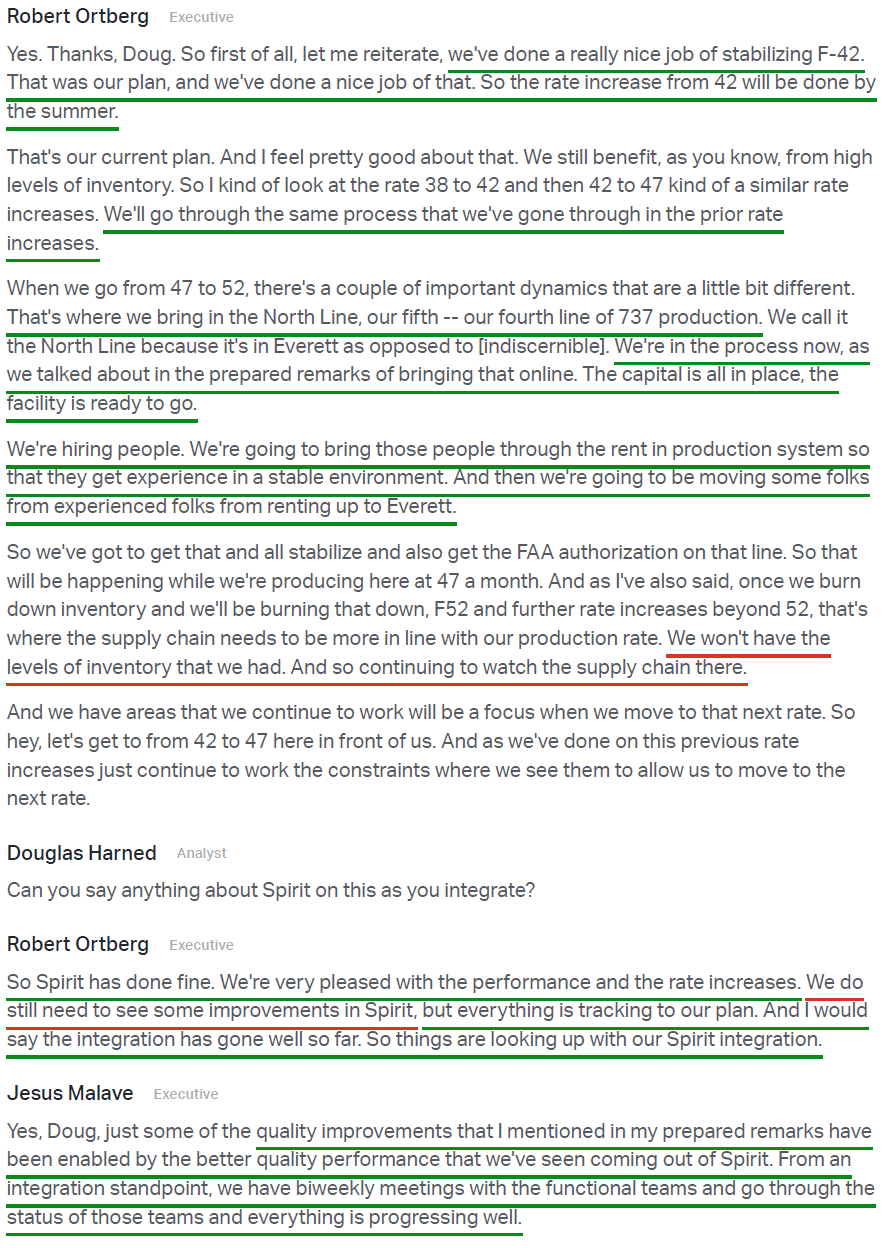 3) The 737 program stabilized at 42 aircraft per month during the quarter, delivering the final 737 MAX out of storage while continuing to drive quality improvements, with final assembly rework hours down nearly 20% Y/Y. Boeing delivered 114 737s in Q1 and remains on track for the full-year target of ~500 deliveries. Management also reiterated its plan to increase production to 47 per month this summer, noting that the recent wiring issue (which held up 25 jets, most of which have since been reworked and delivered) will not affect full-year delivery plans. Both internal and external supply chains are well positioned for the next step up, with the new Everett North Line now prepared to support future rate increases beyond 47 per month.