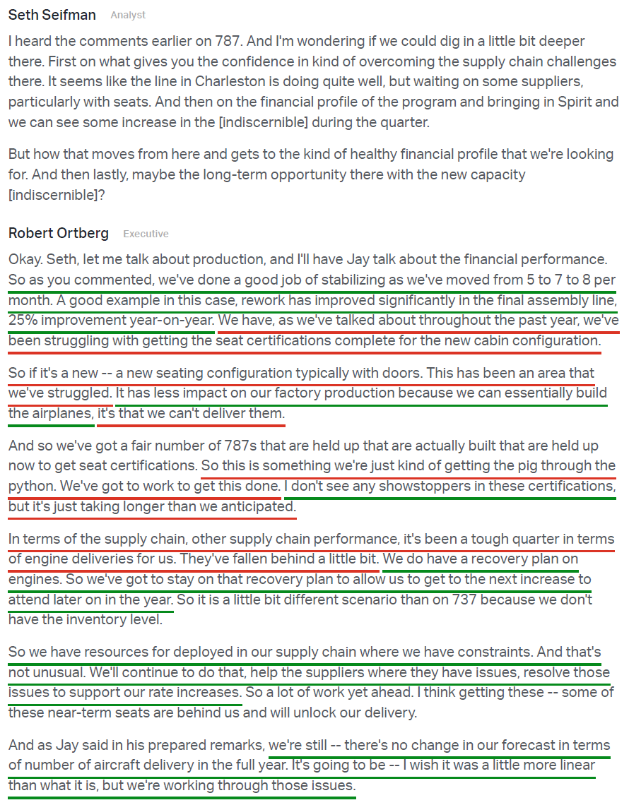 4) The 787 program stabilized at 8 aircraft per month during the quarter, with rework hours down more than 25% Y/Y. Boeing delivered 15 787s in Q1, in line with guidance and up from 13 last year, and continues to target 90-100 deliveries for the full year. The program is working through some premium seat certification delays that have impacted delivery timing, though management emphasized the impact is contained to deliveries rather than production, as the airplanes can still be built but not yet handed over to customers. The next rate increase to 10 per month remains on track for later this year.